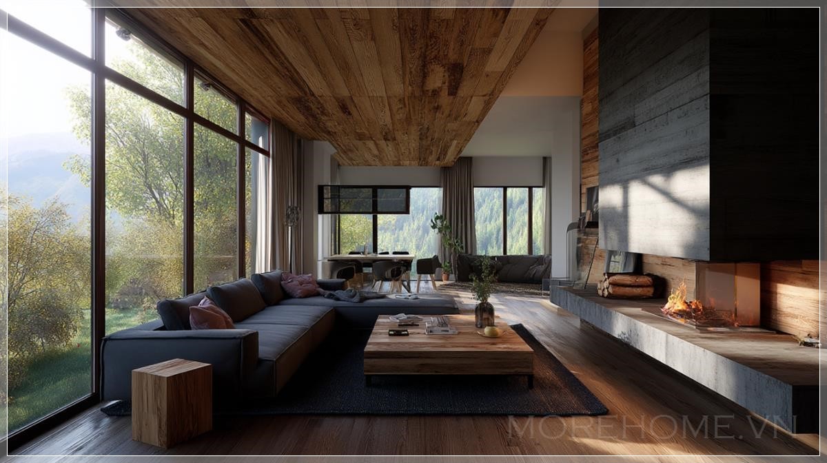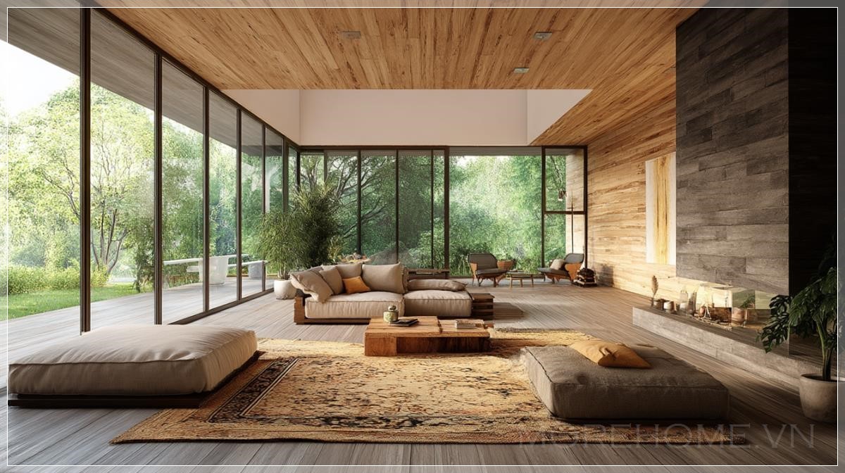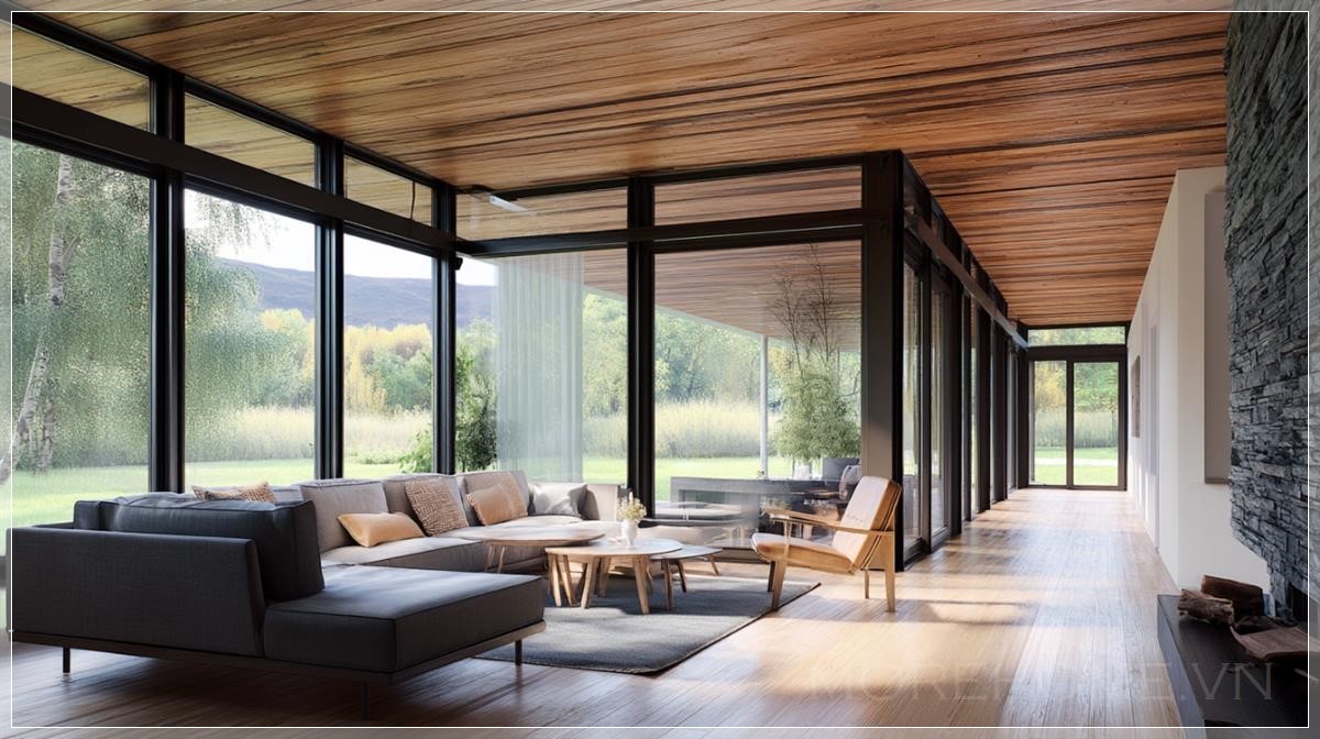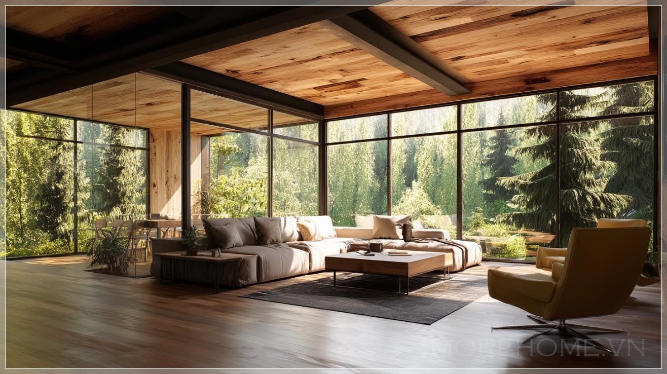 Nội thất biệt thự hiện đại, với các chi tiết gỗ tự nhiên, chất liệu tự nhiên, phòng khách ấm cúng, cửa sổ từ sàn đến trần, thiết kế tối giản.