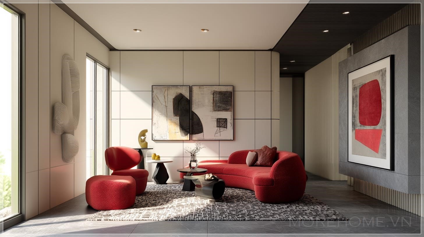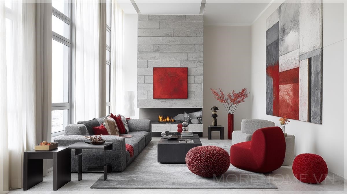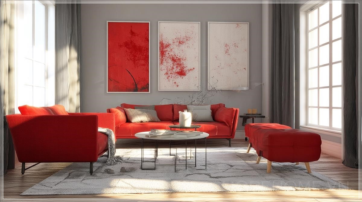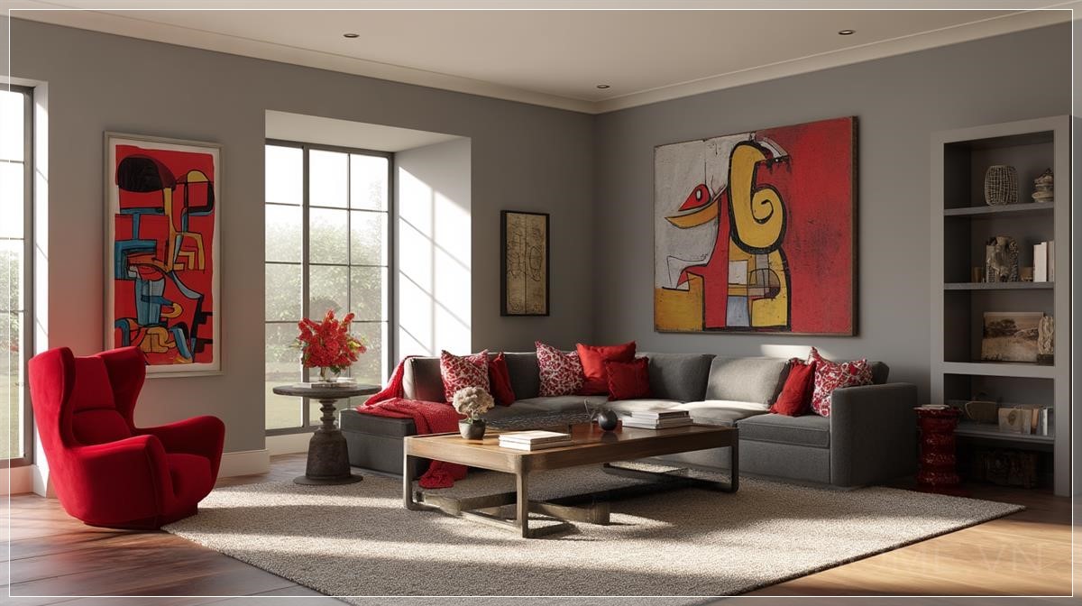 Phòng khách hiện đại tối giản, bảng màu đỏ và xám, mang đậm cảm giác nghệ thuật mạnh mẽ, ấm áp, lấy cảm hứng từ Kelly Hoppen và Joan Miró. Các đường nét sạch sẽ, nghệ thuật trừu tượng, thiết kế đương đại, ánh sáng tự nhiên, không gian ấm cúng.