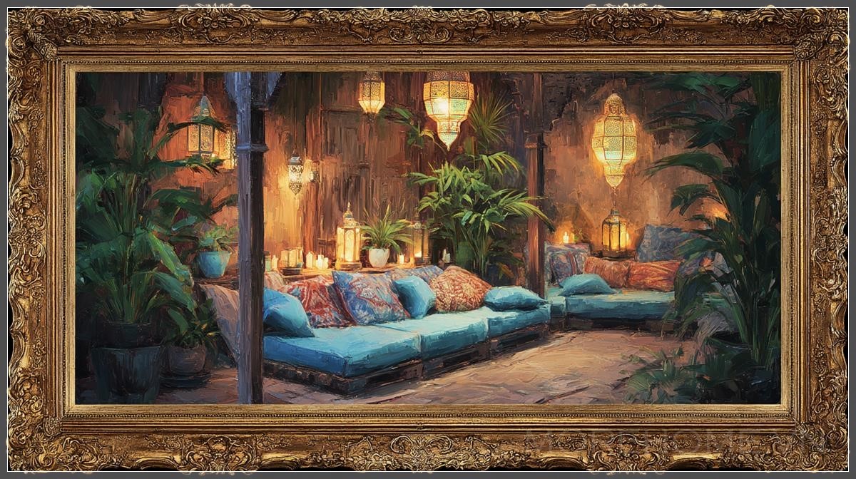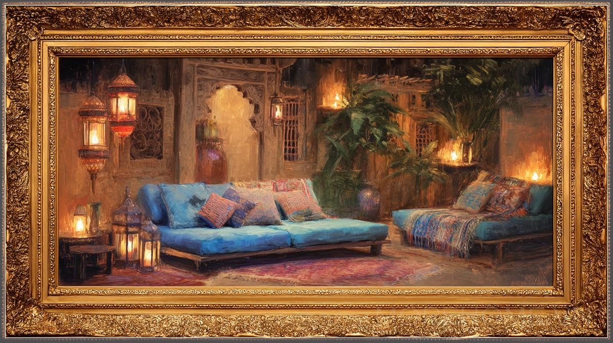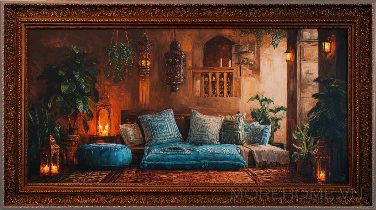 Tranh sơn dầu truyền thống theo phong cách Ấn tượng, miêu tả một phòng khách bohemian ấm cúng với những đệm ngồi màu xanh, gối ôm họa tiết, tường gỗ mộc mạc, đèn lồng Maroc, cây xanh tươi tốt và những ngọn nến lung linh. Không gian tỏa ra sự ấm áp và bình yên với các chất liệu đan lát và ánh sáng dịu nhẹ. Bức tranh được vẽ với những nét cọ biểu cảm và bảng màu lãng mạn, mềm mại. Tranh được đặt trong khung gỗ cổ điển với các chi tiết chạm khắc vàng rực rỡ và hoa văn Baroque tinh tế. Ánh sáng ấm áp, dịu dàng chiếu sáng tác phẩm nghệ thuật, làm nổi bật kết cấu và tạo nên một hiện diện sống động, như thể treo trong một không gian nội thất cổ điển. Tỷ lệ khung hình 16:9 đầy đủ, không gian không bị bỏ trống.