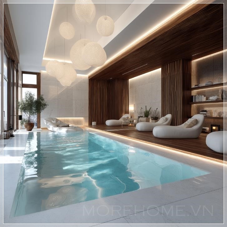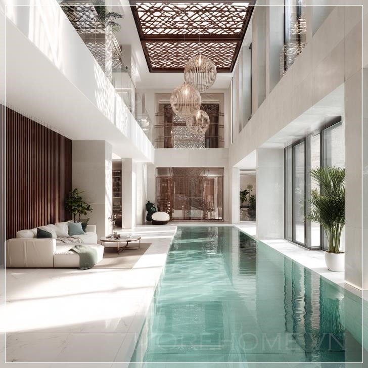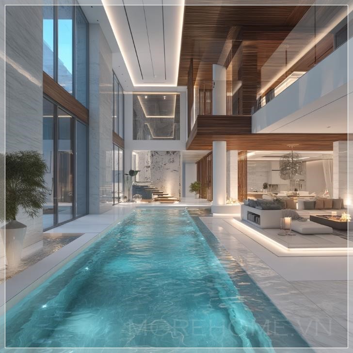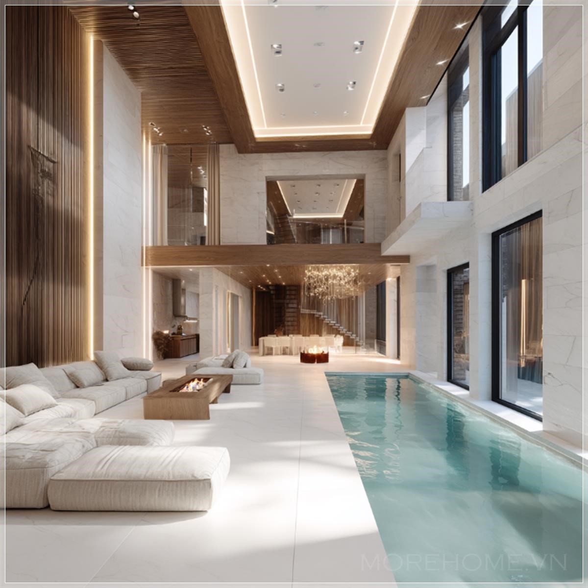 Nội thất hiện đại, biệt thự sang trọng với hồ bơi trong nhà ở Dubai, sử dụng bảng màu trắng và gỗ. Thiết kế 3D.
