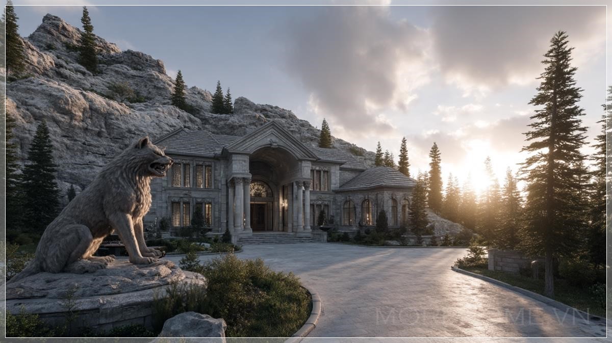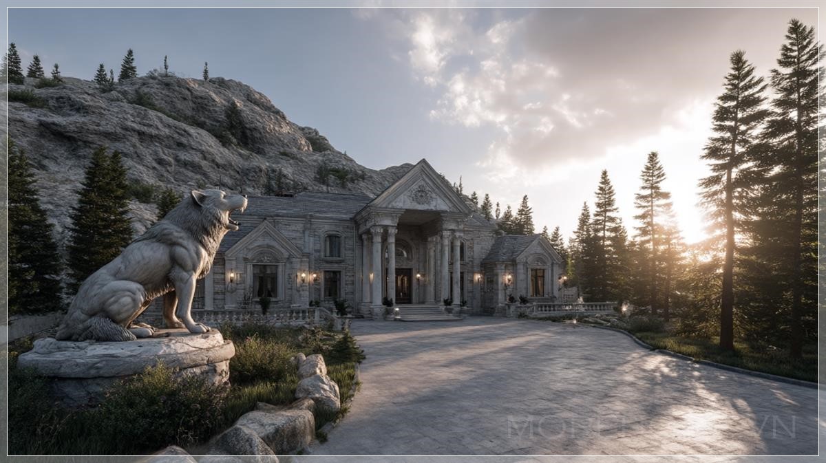 Mansion cực kỳ chân thực xây dựng trong lòng núi, bầu trời sáng sớm, đường lái xe sang trọng dẫn đến lối vào ngôi nhà, tượng sói.