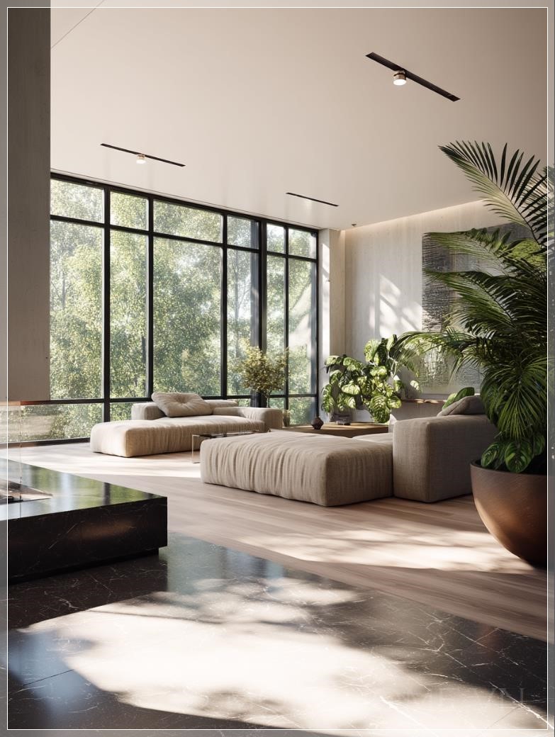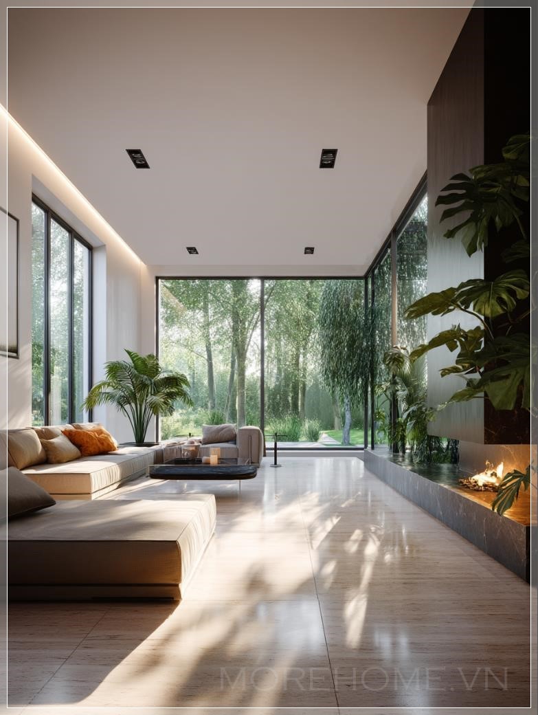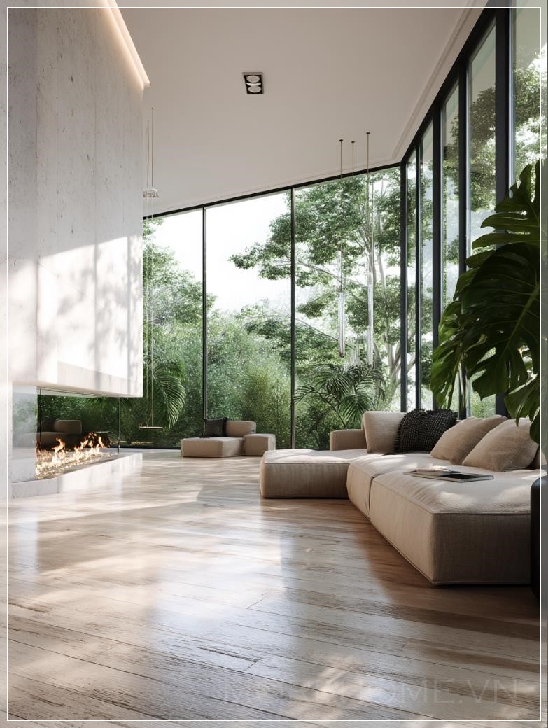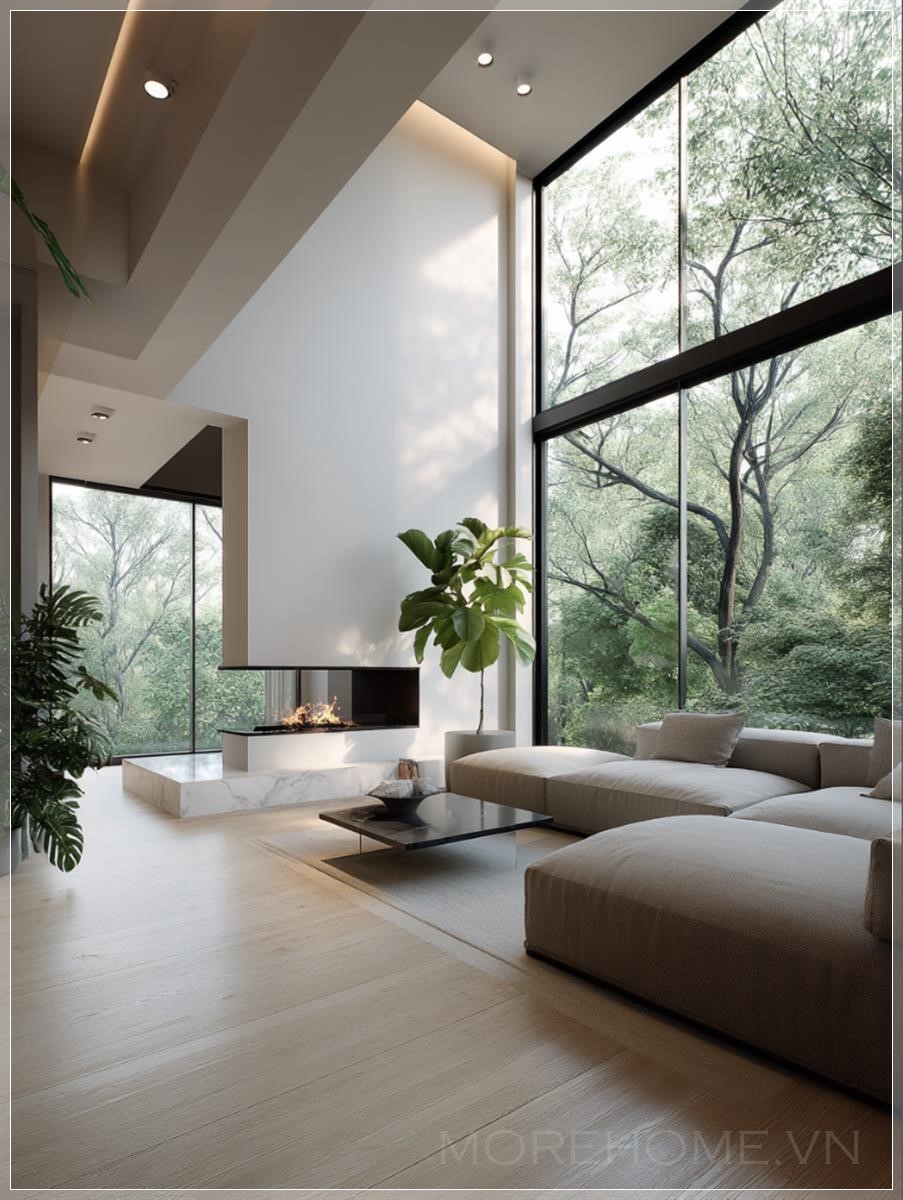 Nội thất phòng khách tối giản hiện đại, không gian mở rộng với cửa sổ từ trần đến sàn chiếm 40% khung cảnh, cây cối dày đặc của những cây lá rộng (maple và cypress) có thể nhìn thấy qua kính với chiều sâu không gian. Bảng màu trung tính với sàn gỗ sồi ấm và tường sơn matte trắng, đồ nội thất được thiết kế theo kiểu dáng gọn gàng với các hình khối đơn giản, hệ thống chiếu sáng âm trần tạo ra ánh sáng mềm mại, lò sưởi treo hiện đại làm điểm nhấn chính. Cây monstera trong chậu trang trí gần cửa sổ, ánh sáng mặt trời chiếu qua lá cây tạo ra các hình bóng tự nhiên trên sàn đá cẩm thạch bóng loáng. Hình ảnh được tái tạo ở độ phân giải 8K với chất lượng mô phỏng kiến trúc, ống kính góc rộng làm nổi bật sự lưu thông không gian, các chi tiết kết cấu tinh tế từ vải lanh bọc ghế và các điểm nhấn kim loại chải, thiết kế sinh học tích hợp với cây xanh ngoài trời.