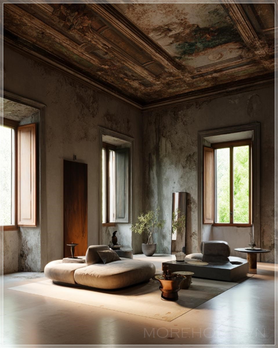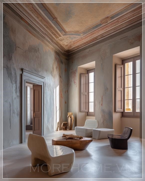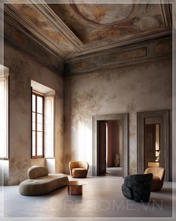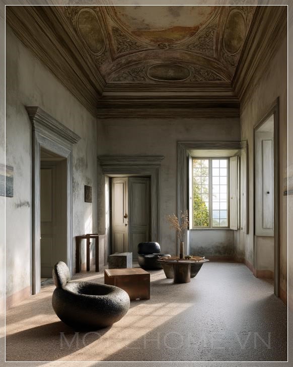 Nội thất của một biệt thự lịch sử Ý, với trần nhà fresco nguyên bản và tường vữa đã bị xói mòn, ánh sáng tự nhiên mềm mại chiếu vào từ những cửa sổ cổ điển cao, được bài trí với những món đồ nội thất điêu khắc hiện đại làm từ đá và kim loại patina, kết cấu tối giản, bề mặt thô, vẻ đẹp cổ kính, không khí di sản Ý, phong cách wabi-sabi, thẩm mỹ vượt thời gian và đầy chất thơ, đồng thau chải mịn, đồng bị oxi hóa, đá thô, gỗ đã qua thời gian, góc nhìn rộng, góc nhìn từ dưới lên.