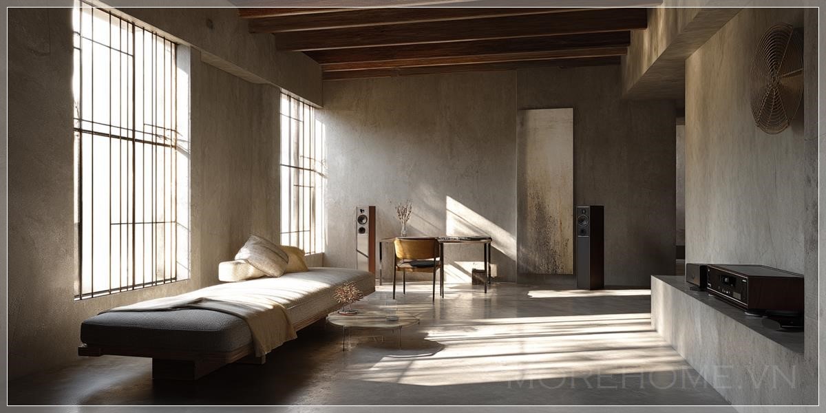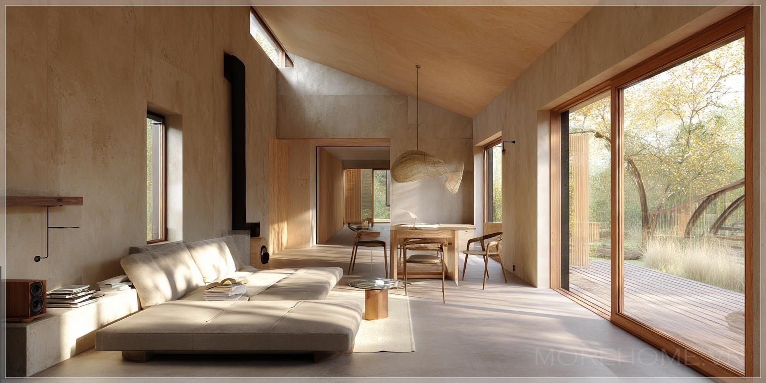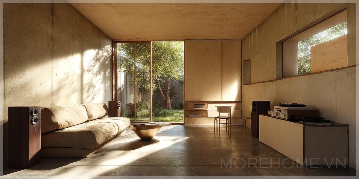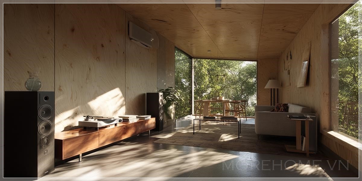 Không gian phòng khách và phòng ăn của một ngôi nhà nhỏ, ấm cúng, mang phong cách zen tối giản với tường và trần bằng plywood và bê tông sáng màu. Bộ sofa đơn giản, một chiếc đầu đĩa than NAD phong cách thập niên 90 và các loa đứng. Ánh sáng chiếu qua các khe cửa sổ tạo ra những vệt sáng nhè nhẹ trên nền nhà. Cảnh vật ngoài trời mờ ảo, lấy cảm hứng từ phong cách kiến trúc của Melbourne, với không gian tĩnh lặng và thanh bình. Bức ảnh được chụp bằng máy ảnh Sony Alpha, với chất lượng hình ảnh cao cấp, sử dụng công nghệ MIR Render.