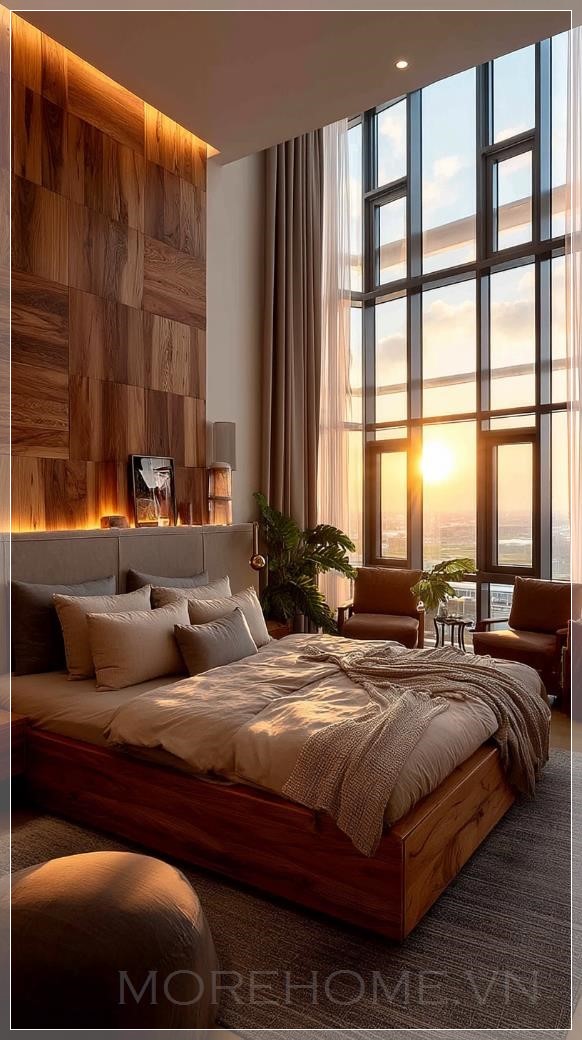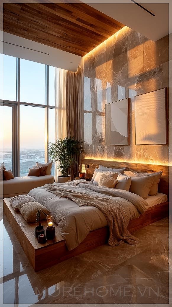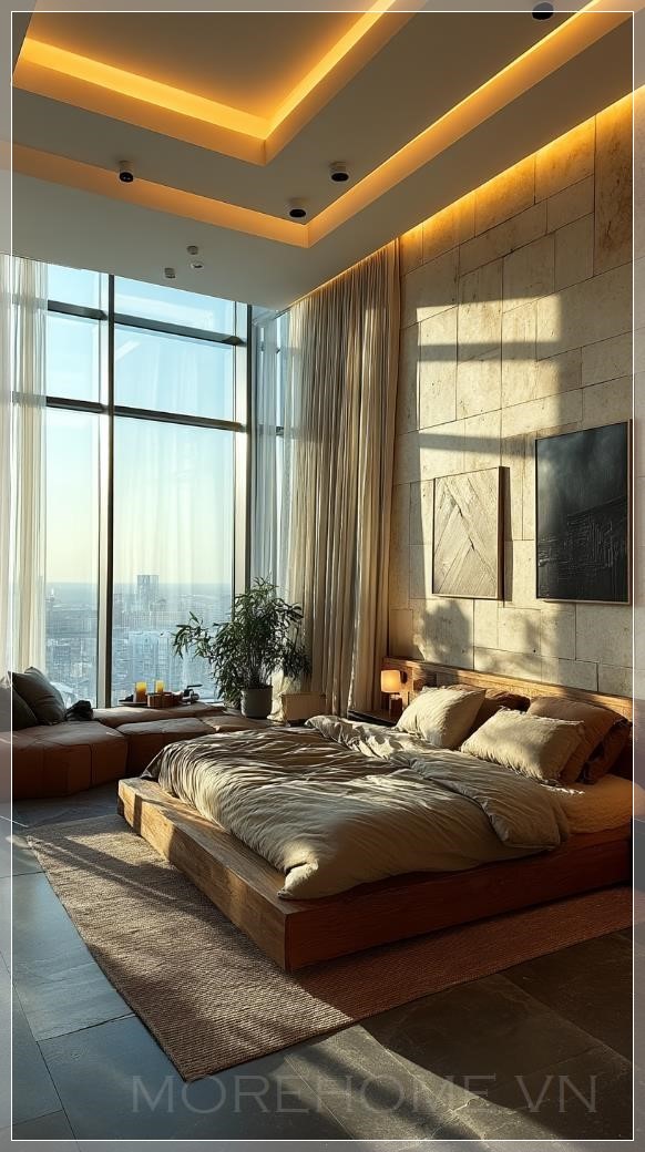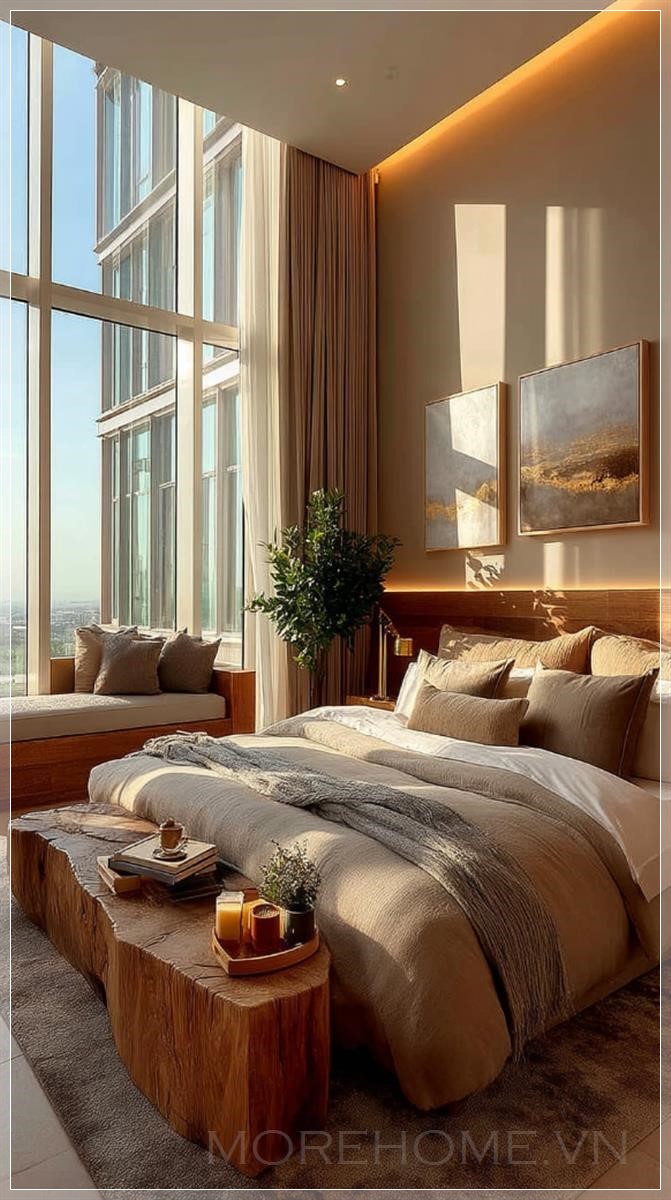 Phòng ngủ phong cách Saudi sang trọng với thiết kế tối giản và ấm áp. Phòng có các tông màu be và kem thanh lịch, kết cấu gỗ mềm mại và nội thất hiện đại chất lượng cao. Không gian gọn gàng và yên tĩnh, với một chiếc giường cỡ king-sized được phủ chăn ga nệm màu trung tính và những chiếc gối êm ái. Các chi tiết trang trí tinh tế phản ánh gu thẩm mỹ tinh tế, như các họa tiết hình học và các điểm nhấn màu vàng hoặc đồng. Ánh sáng mặt trời nhẹ nhàng chiếu vào qua rèm tự động mượt mà, tạo ra những tia sáng vàng dịu dàng khắp phòng, mang lại không gian buổi sáng yên bình. Bầu không khí tổng thể toát lên sự thoải mái, tinh tế và sang trọng khiêm nhường. Ghi chú máy ảnh và ánh sáng: Chụp góc rộng, ánh sáng tự nhiên buổi sáng. Ống kính: 24mm, f/4.0. Ánh sáng mặt trời chiếu qua rèm bán mở tạo ra những vệt sáng mềm mại và sự tương phản nhẹ nhàng. Yêu cầu không có: Không có sự bừa bộn, không có màu sắc tối, không có đồ đạc nặng nề truyền thống, không có trang trí quá mức, không có người trong phòng.