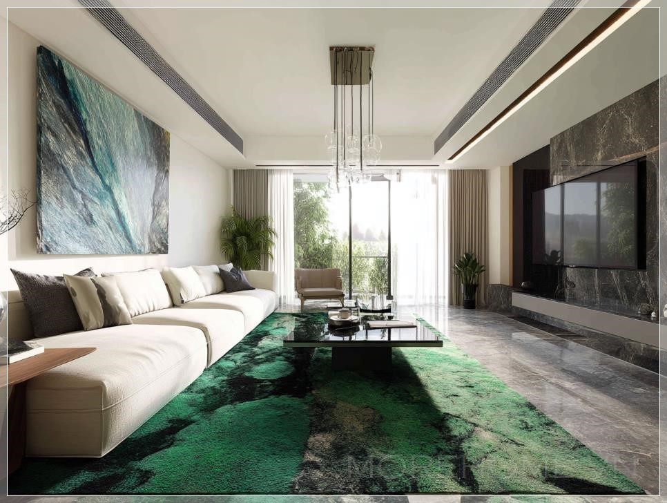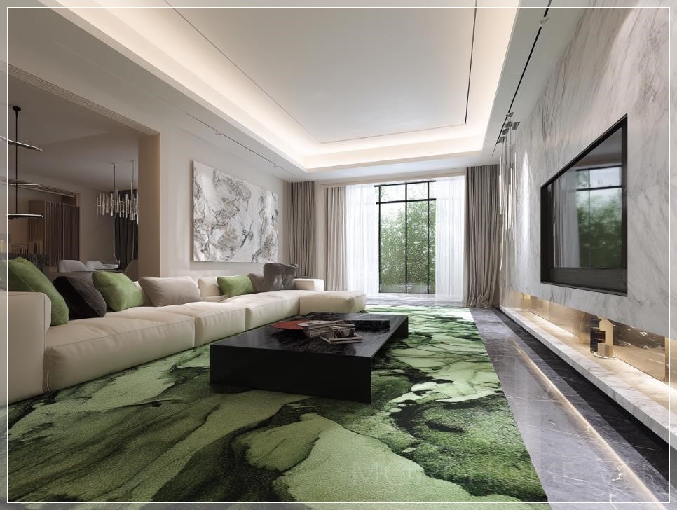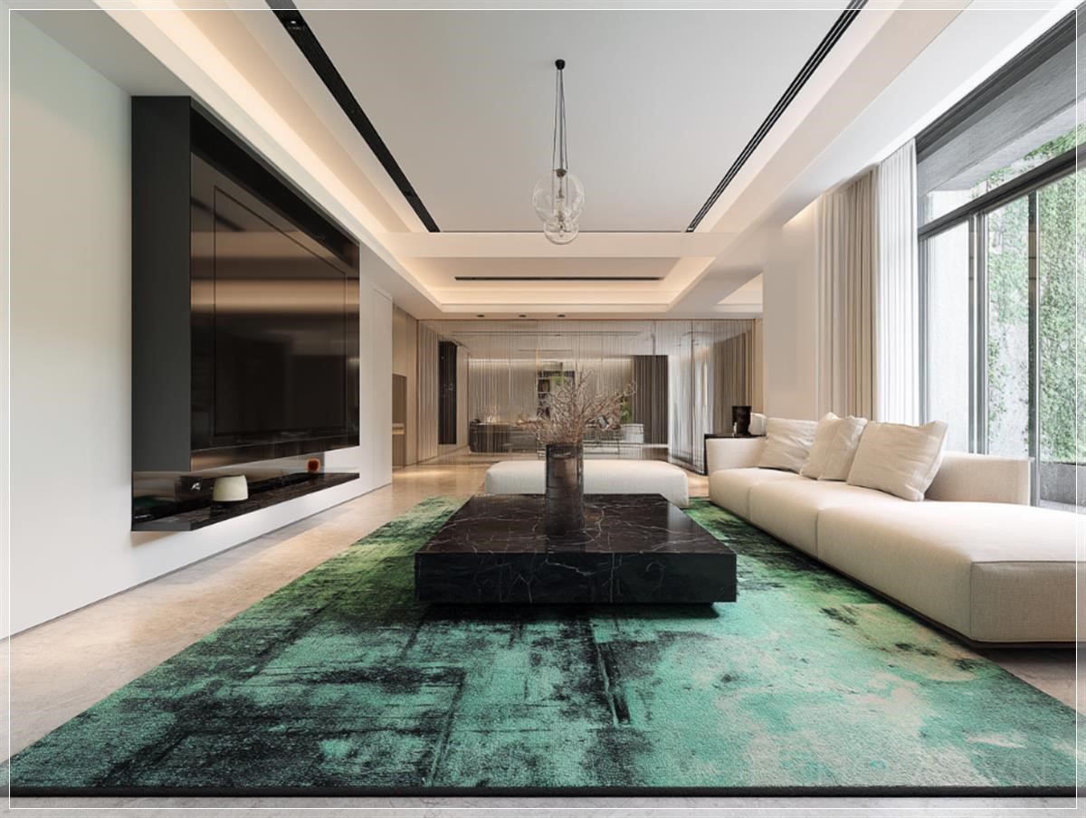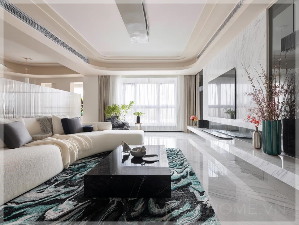 PhPhòngòng khách hiện khách hiện đại đại phong cách avant theo phong cách avant-garde, diện tích từ 150 đến 170 mét-garde với diện tích từ 150 đến 170 mét vuông, vuông, rộng 7m và sâu 8m, trần phẳng cao chiều ngang 7m và chiều sâu 8m, trần 3.5m, góc nhìn toàn cảnh từ phía phẳng cao 3.5m. Góc nhìn toàn cảnh bắc. Bức tường phía đông bố trí một từ hướng bắc cho thấy bố cục không gian rõ chiếc sofa dài tông màu trắng ngà, thiết kế tuyến ràng và cân đối. Bức tường phía tính tạo cảm giác thanh thoát. Trung tâm không đông được bố trí một bộ sofa dài màu trắng gian là bàn cà phê bằng đá cẩm thạch đ ngà theo đường thẳng, tạo nên cảm giác thanhen, nổi bật trên thảm trải sàn họa lịch và tối giản. Trung tâm phòng là bàn cà tiết trừu tượng tông xanh, tạo điểm nhấn thị phê bằng đá cẩm thạch đen bóng, giác táo bạo. Tường phía tây nổi bật trên tấm thảm hoa văn trừu tượng màu xanh lá cây tích hợp hệ thống TV mỏng, đóng vai trò điểm nhấn thị giác. Ph gọn, phong cách hiện đại tối giản. Phía nam là cửa kính rộng 7m, cao kía tây là hệ thống TV gắn tường thiết kếịch trần, mang đến ánh sáng tự nhiên d gọn gàng, liền mạch với bềồi dào và mặt tường. tầm nhìn mở thoáng đãng. Tr Mặt kính rộng 7m ở phía nam mởần nhà được thiết kế chiếu sáng hắt khe ra tầm nhìn thoáng đãng, tràn ng tinh tế kết hợp đèn thả nghệ thuậtập ánh sáng tự nhiên. Trần nhà sử dụng, làm nổi bật từng vùng chức năng trong không ánh sáng hắt khe tinh tế kết hợp với gian. Từng đèn chi tiết thả nghệ vật liệu thuật, và ánh tăng thêm chiều sâu cho không gian. Từng khu vực chức sáng đều được tái hiện chân thực, mang lại cảm giác sống động, hiện đại và đầy tính nghệ thuật. năng trong phòng đều được phân chia hợp lý, vật liệu và ánh sáng được xử lý chân thực, mang lại cảm giác sống động, sang trọng và mang đậm dấu ấn cá tính nghệ thuật hiện đại.