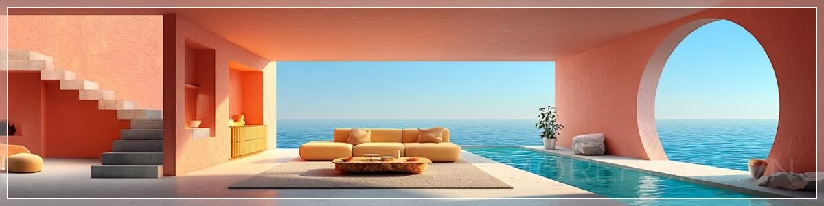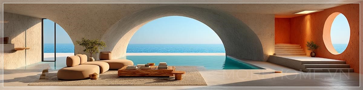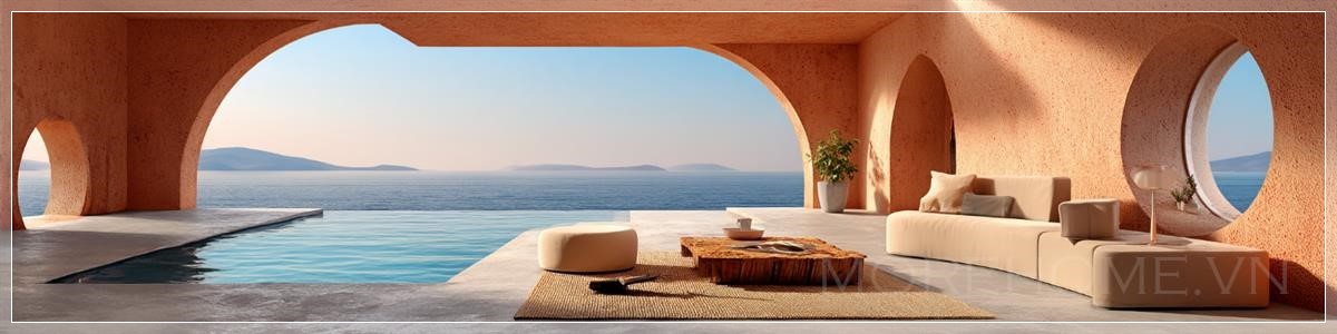 Không gian nội thất siêu thực với những bức tường và bậc thang uốn lượn mềm mại, màu sắc ấm áp, nhẹ nhàng như be nhạt và gạch đỏ nhạt. Căn phòng bao gồm các ghế ngồi hình tròn tối giản, một chiếc sofa bọc vải màu cát nhạt và một chiếc bàn cà phê bằng gỗ thấp với lớp hoàn thiện mộc mạc. Một vài cuốn sách vương vãi trên sàn cạnh tấm thảm mềm mại, tạo nên cảm giác ấm cúng, gần gũi. Cửa sổ lớn từ sàn đến trần mở ra, hé lộ một đại dương bao la phía ngoài, trải dài vô tận dưới bầu trời pastel nhẹ nhàng. Những đợt sóng nhẹ nhàng phản chiếu ánh sáng, tạo nên một không gian yên bình và thiền định. Những gam màu xanh mát và ánh sáng phản chiếu từ đại dương hòa quyện với sắc thái ấm áp của không gian nội thất, tạo nên sự tương phản tuyệt đẹp. Ánh sáng tự nhiên mềm mại từ đại dương xuyên qua cửa sổ, chiếu những bóng đổ nhẹ nhàng và làm nổi bật các kết cấu của đồ đạc và tường nội thất hữu cơ. Bầu không khí yên tĩnh và không giống thế giới, kết hợp các hình dạng hữu cơ của nội thất với vẻ đẹp tối giản và bình lặng của đại dương.