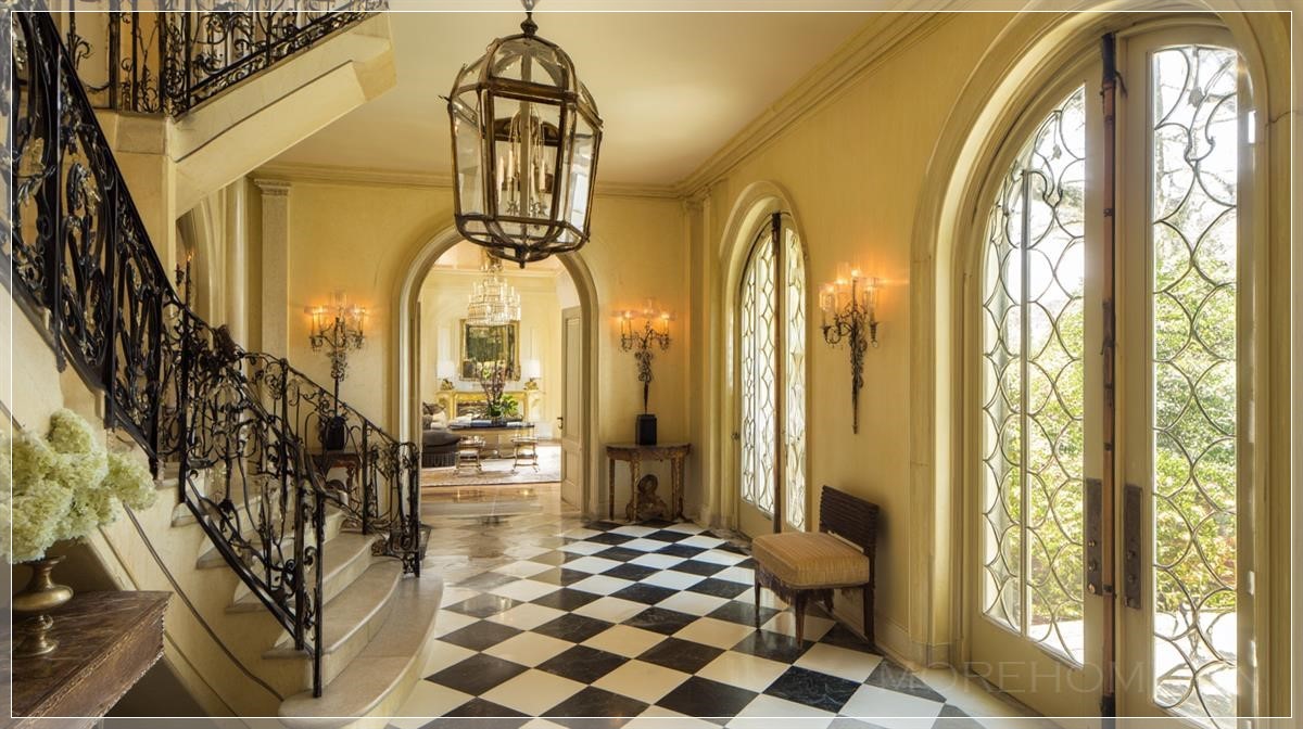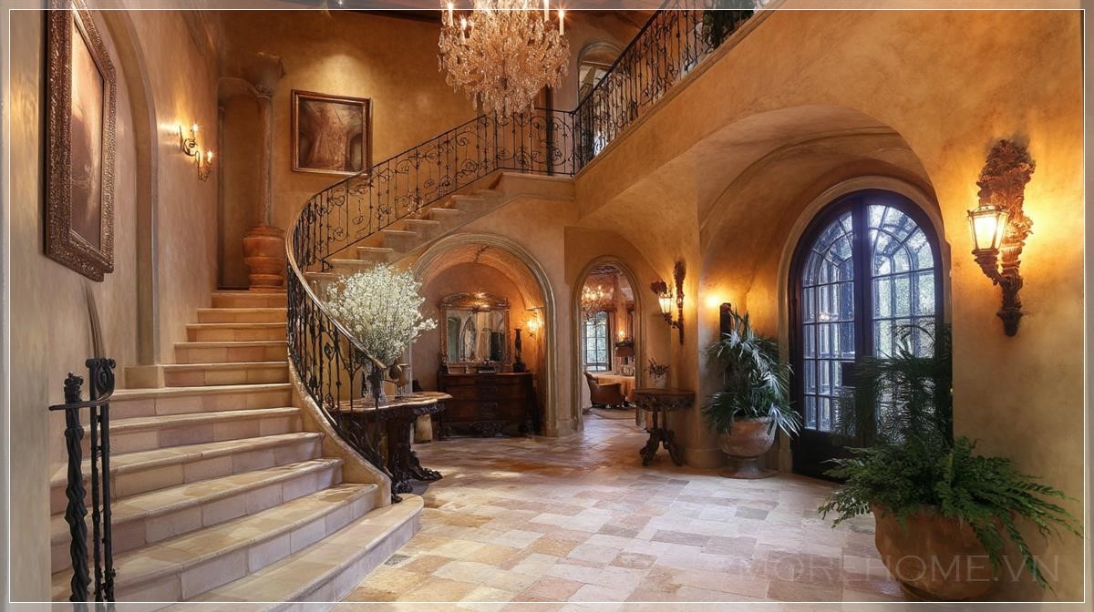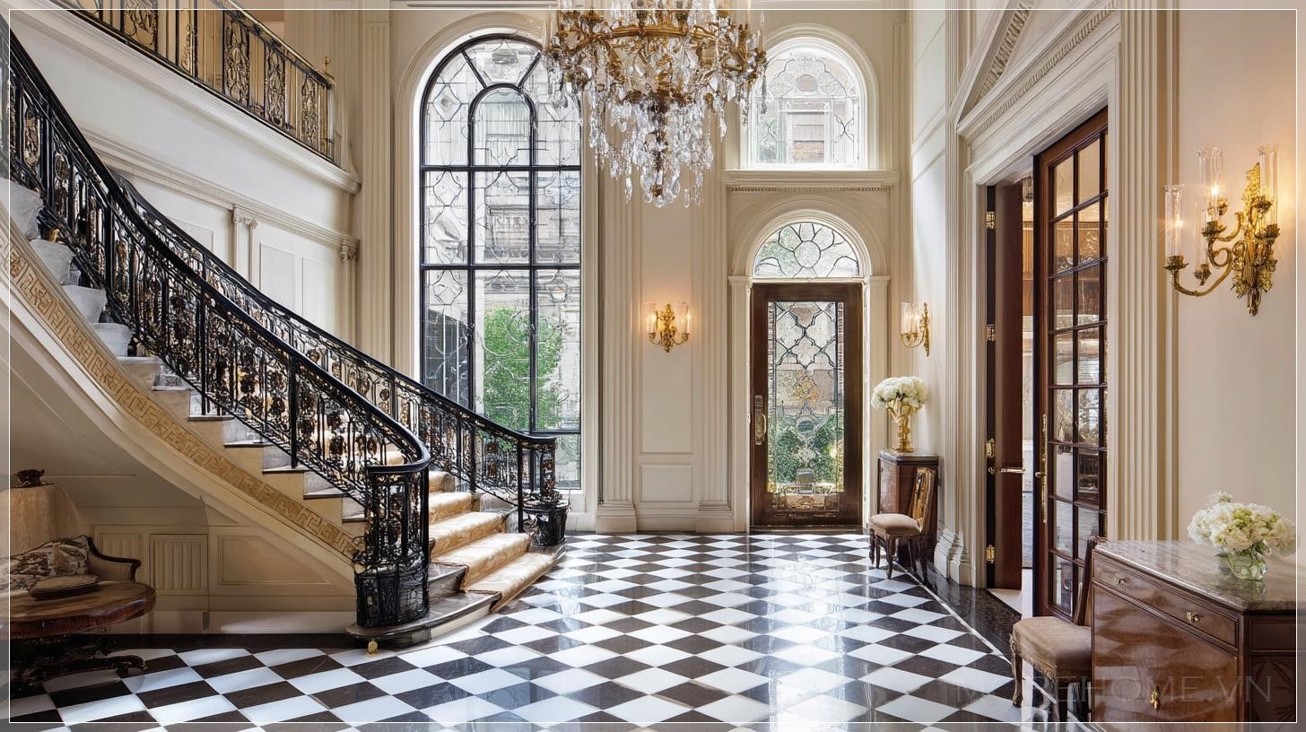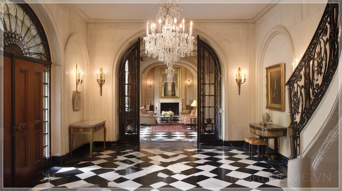 Lối vào rộng lớn của một biệt thự cổ trên bờ biển Gold Coast, với cầu thang sắt uốn cong quyến rũ, sàn đá cẩm thạch với họa tiết ô vuông, đèn chùm Murano cổ điển và cánh cửa đôi hình vòm mở ra phòng khách trang trọng. Những chiếc đèn tường mềm mại tạo ánh sáng ấm áp, mang lại không gian thoải mái.