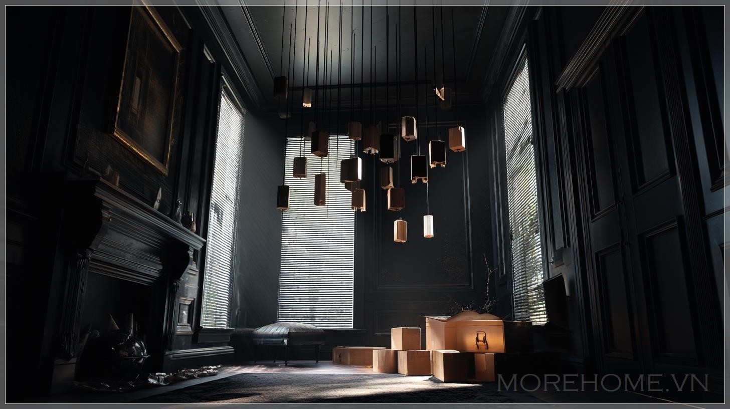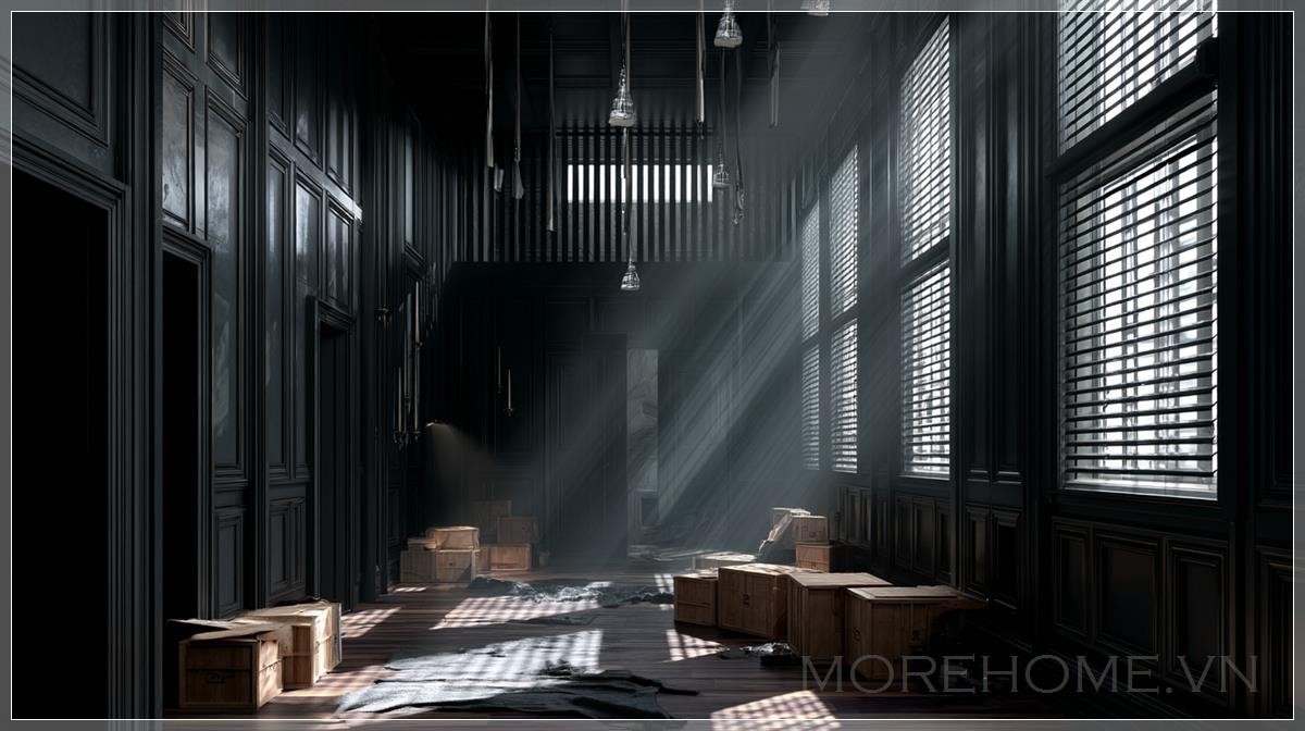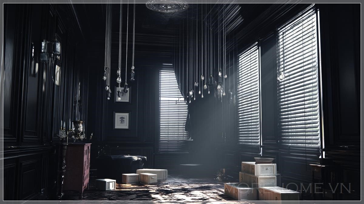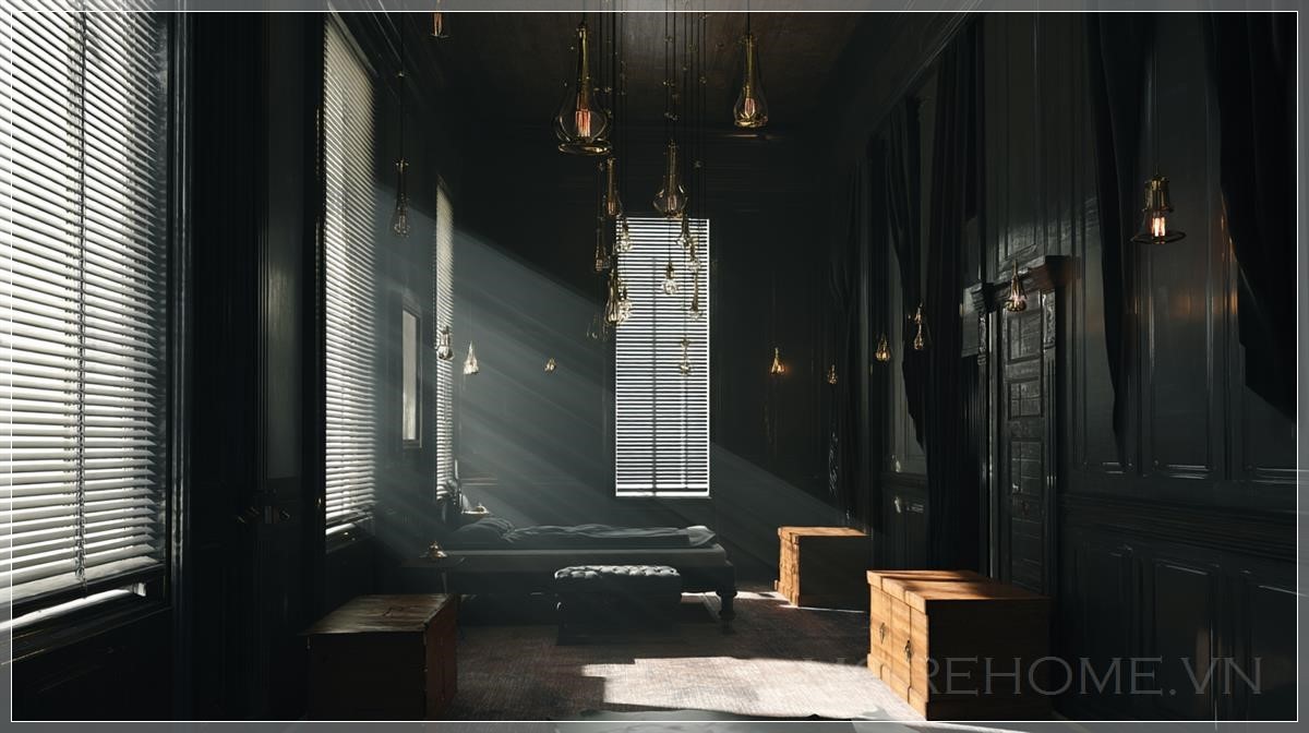 Phòng ngủ trong biệt thự Victorian bỏ hoang và tối tăm. Các bức tường màu đen, với rèm trắng treo trên cửa sổ. Những chiếc hộp được xếp ở một góc phòng, và đèn treo lơ lửng từ trần nhà. Ánh sáng trong phòng mang tính điện ảnh, với ánh sáng volumetric và các tia sáng chiếu xuống, tạo ra một không gian huyền bí và u ám.