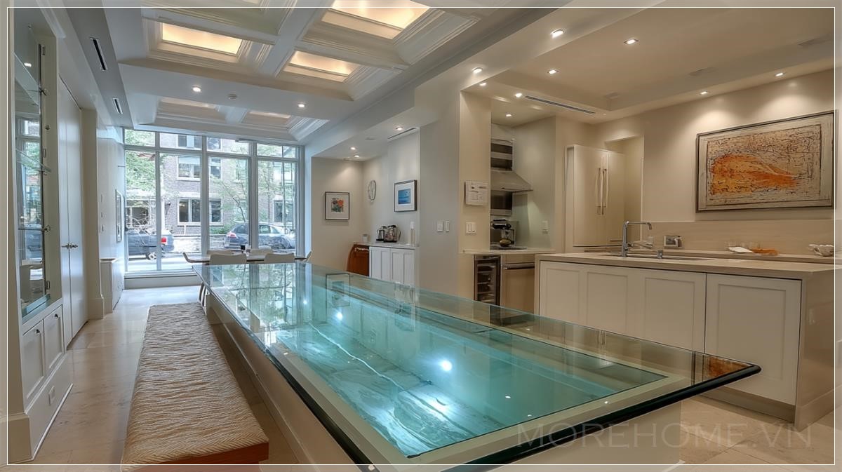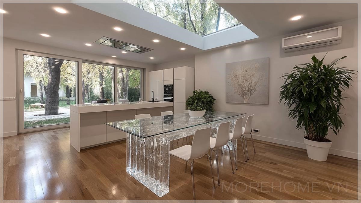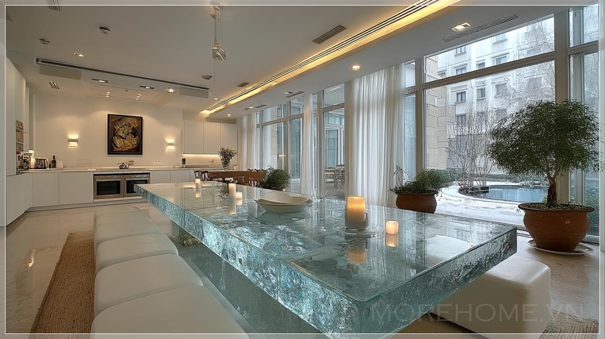Trong một không gian bếp tối giản, nơi sự tinh tế và sự gọn gàng là ưu tiên hàng đầu, chiếc bàn kính trong suốt nổi bật như một điểm nhấn thanh thoát. Được đặt trong một căn bếp trắng tinh, mọi chi tiết đều được thiết kế để tôn vinh sự đơn giản, và chiếc bàn này không chỉ là nơi để ăn uống mà còn là một tác phẩm nghệ thuật đầy ấn tượng.