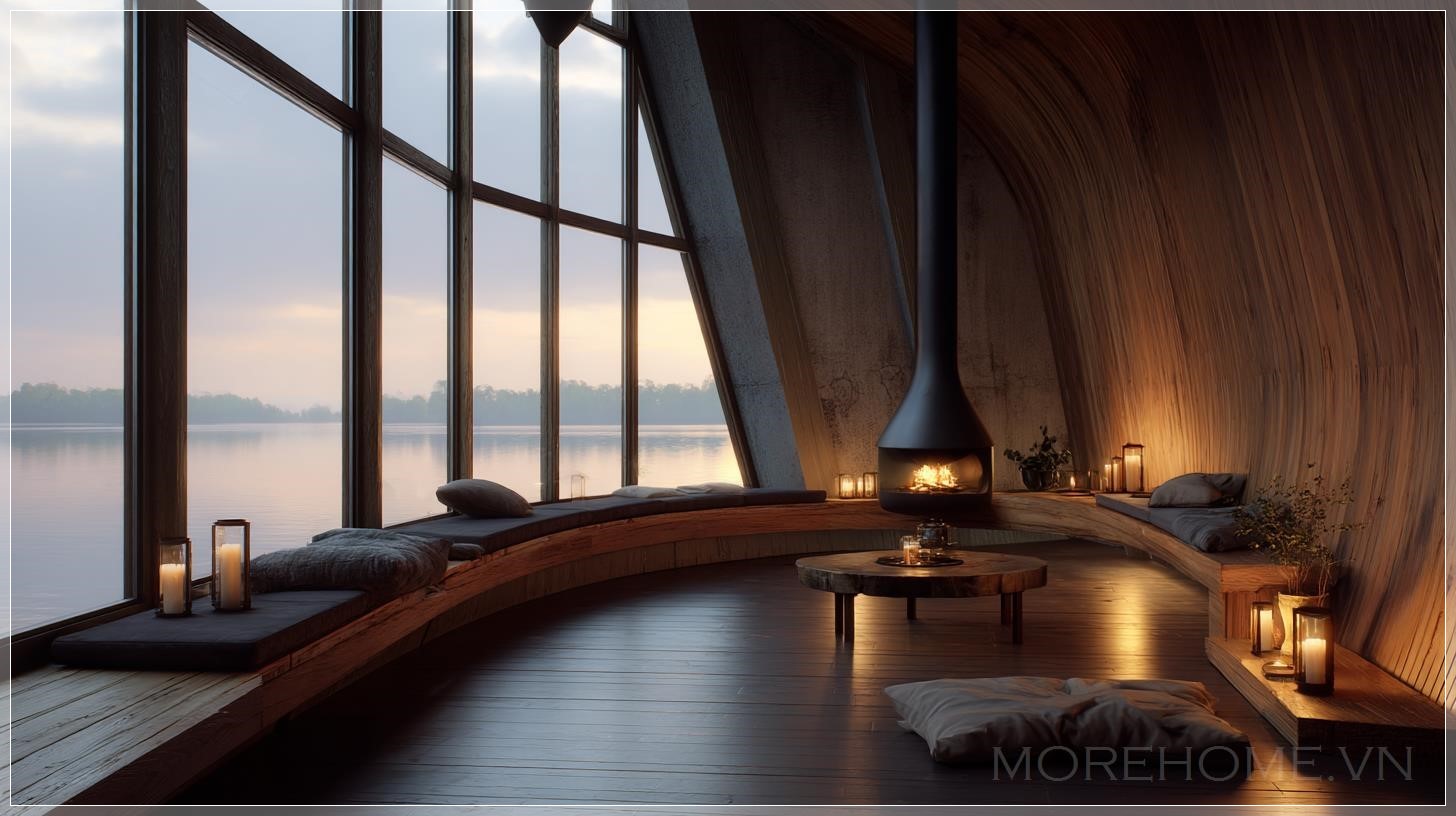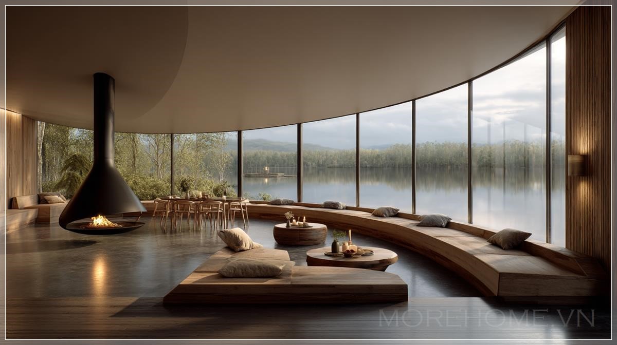 Trong một không gian mở hoàn toàn, những khung cửa kính kéo dài từ sàn đến trần tạo nên bức màn trong suốt, dẫn ánh nhìn thẳng ra mặt hồ phẳng lặng và mênh mông. Ánh sáng tự nhiên phản chiếu lấp lánh trên mặt nước, len lỏi qua các khung kính lớn, tạo nên một lớp ánh sáng mềm mại lan tỏa khắp gian phòng, khiến mọi chi tiết nội thất dường như được bao phủ bởi một lớp sương mờ nhẹ nhàng, đầy chất điện ảnh.