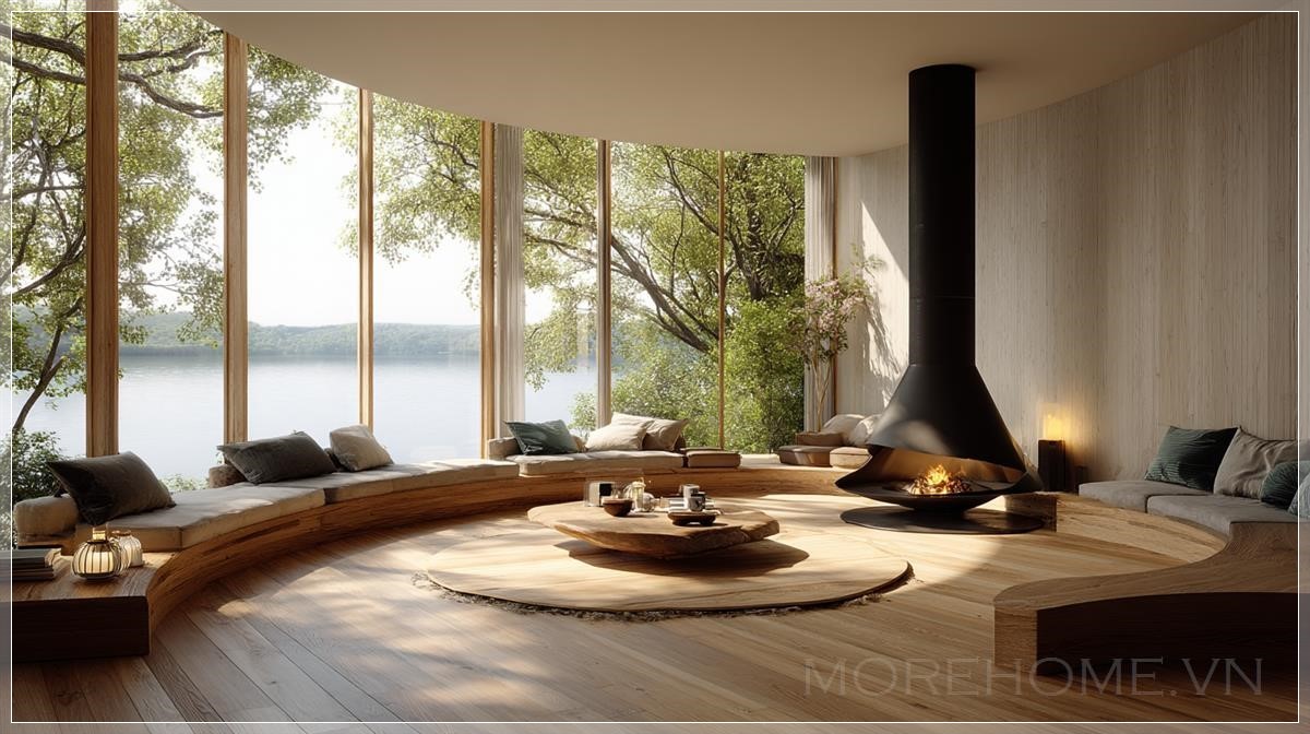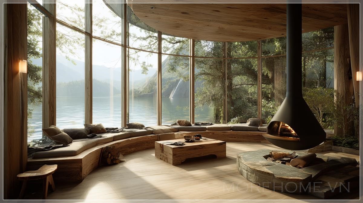 Trung tâm của căn phòng là chiếc lò sưởi bằng củi được thiết kế tinh tế, với ngọn lửa đỏ ấm áp bập bùng như một vũ điệu sống động. Bao quanh nó là những băng ghế gỗ dài uốn cong mềm mại, được chế tác từ những thanh gỗ mịn màng với vân gỗ rõ nét, mang lại cảm giác tự nhiên nhưng không kém phần tinh tế. Sự đối lập giữa hình dáng uốn lượn của ghế và đường nét thẳng của không gian kiến trúc tạo nên một tổng thể hài hòa và sống động.