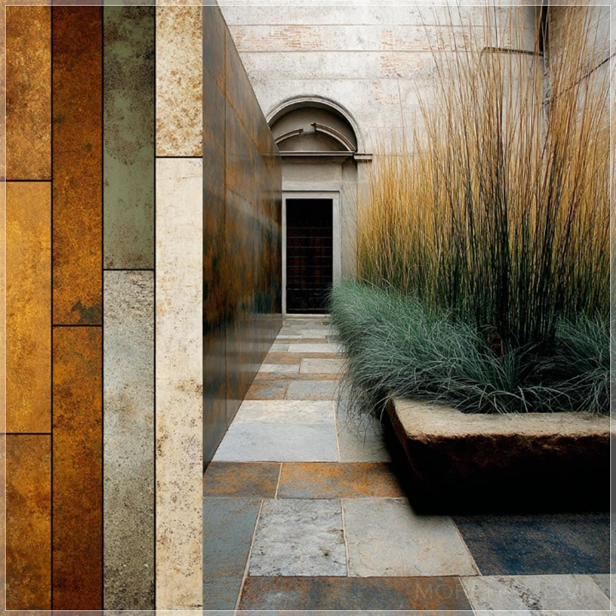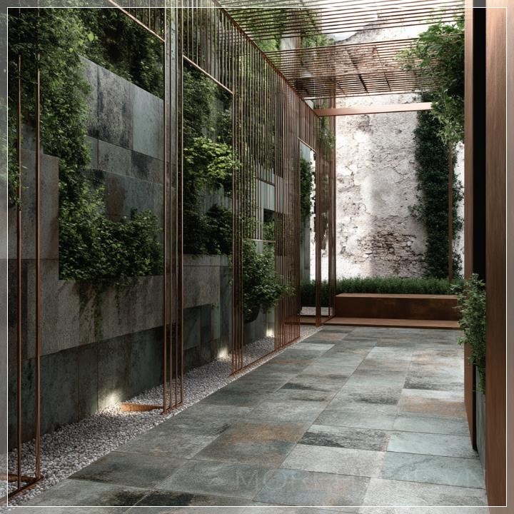 Những lối đi lát đá hình chéo tạo nên sự chuyển động cho không gian, dẫn dắt ánh sáng vào những khu vực khuất tầm nhìn, khiến cho cả khu vườn như được bao phủ trong một lớp ánh sáng dịu dàng. Những bức tường bao quanh được phủ một lớp thực vật leo, như cây hoa nhài và dương xỉ, tỏa ra một hương thơm nhẹ nhàng, hòa quyện với làn gió nhẹ mát mẻ từ những hàng cây cổ thụ, tạo nên một không gian thư giãn tuyệt vời.