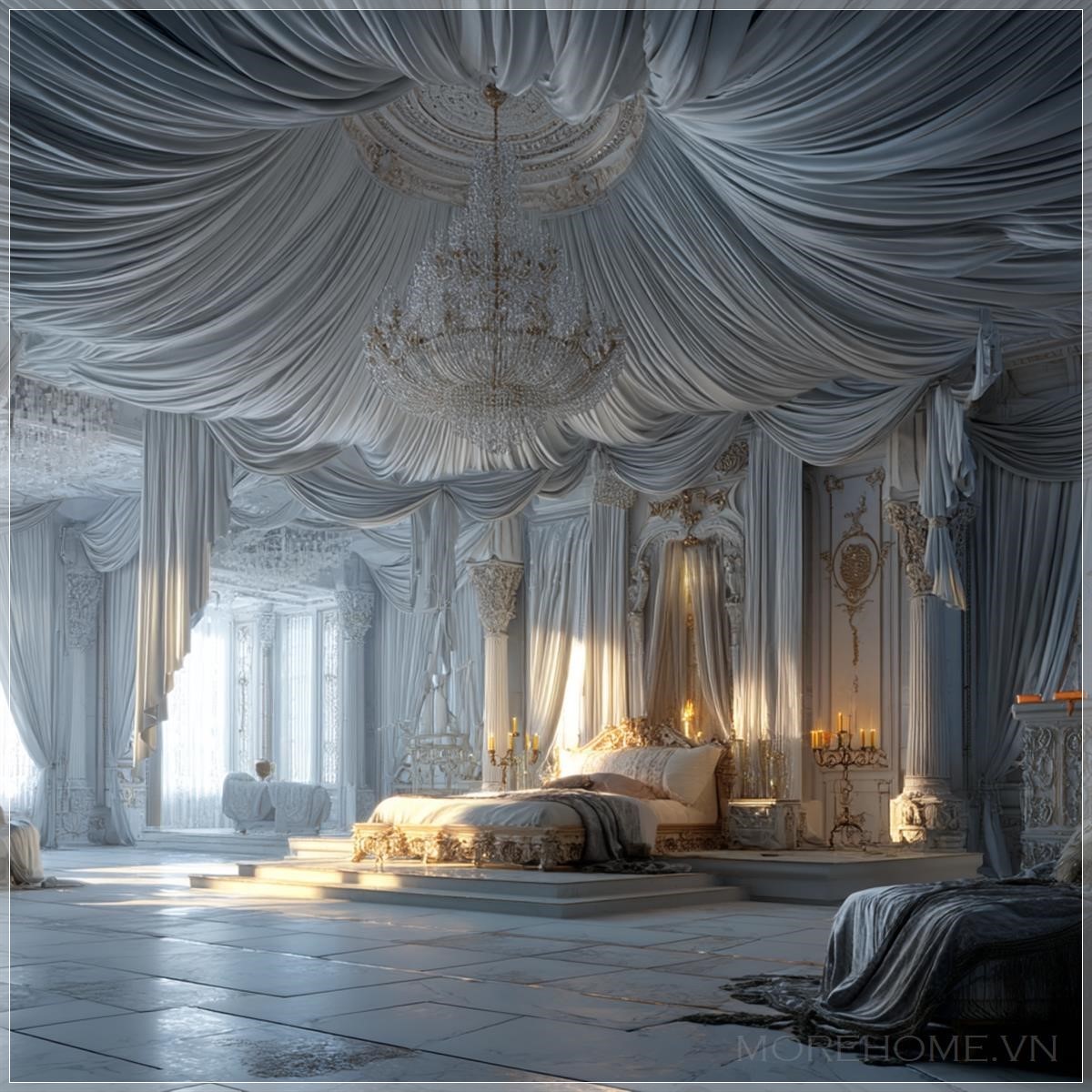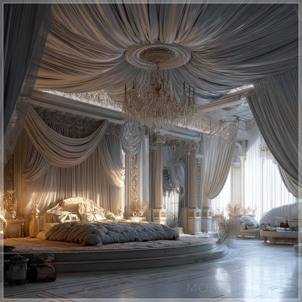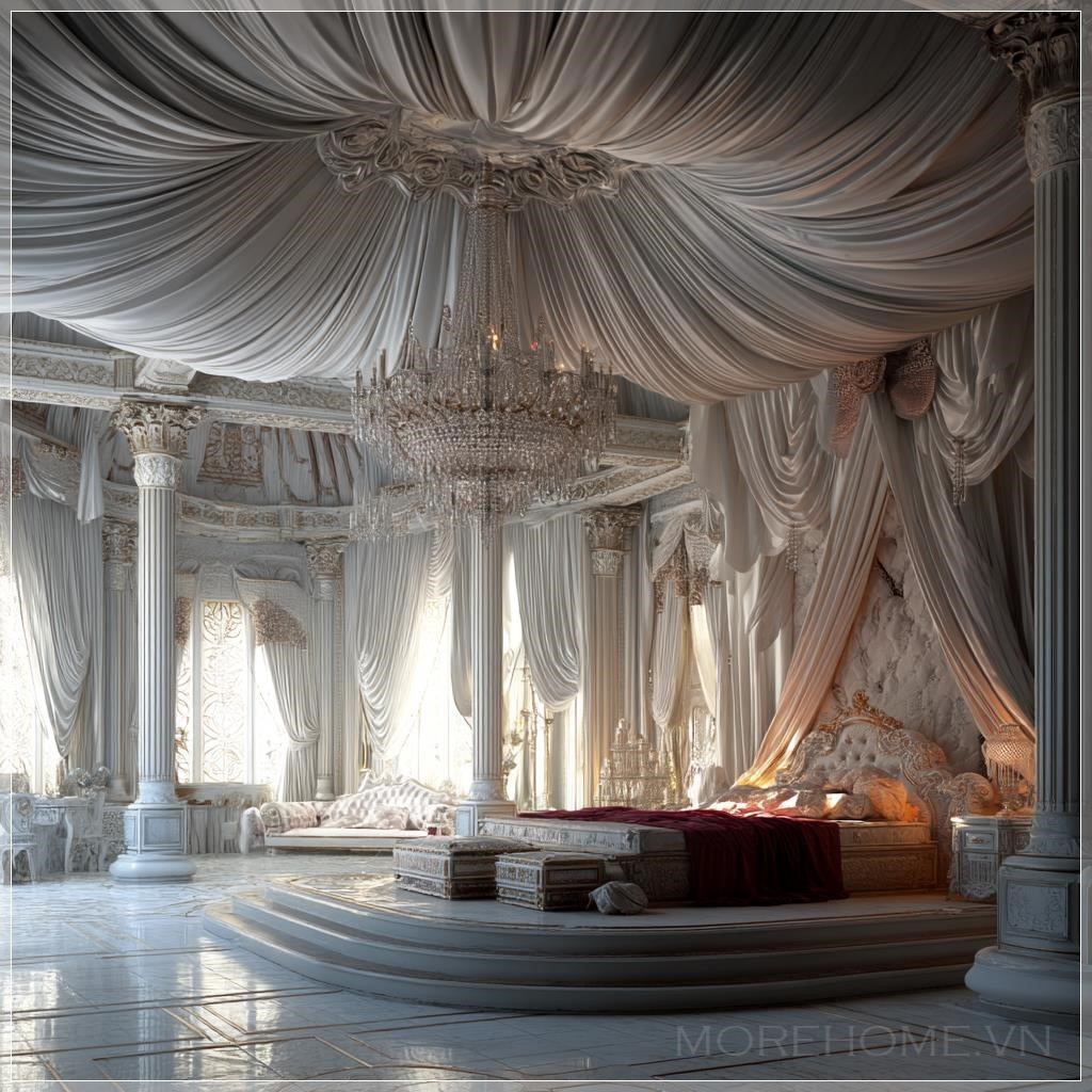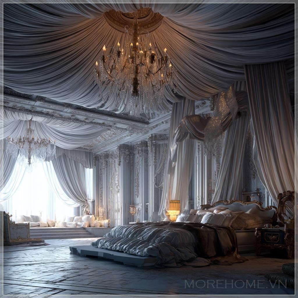 Trần nhà được điểm tô bằng những nếp gấp vải tinh tế, uốn lượn như những đám mây lụa, tạo cảm giác về một bầu trời mộng mơ bao trùm lên không gian nghỉ ngơi. Từ trung tâm, một chiếc đèn chùm pha lê rực rỡ tỏa sáng, phản chiếu ánh sáng qua hàng trăm mặt cắt tinh xảo, tạo nên một vũ điệu ánh sáng kỳ diệu trên mọi bề mặt trong phòng.