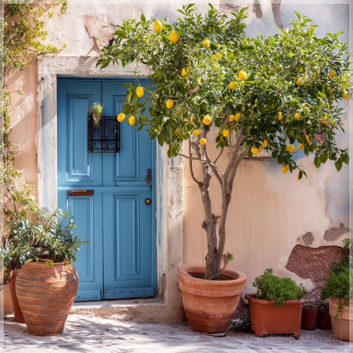 Bên cạnh cánh cửa là cây chanh kiêu hãnh với những quả vàng óng ánh. Trong văn hóa Mediterranean, cây chanh không chỉ là nguồn cung cấp hương vị tươi mát cho ẩm thực mà còn là biểu tượng của sự thanh khiết và khả năng chữa lành. Mùi hương chanh thoang thoảng trong không khí, tạo nên cảm giác sảng khoái và tươi mới, như một lời nhắc nhở về sự sống động của thiên nhiên giữa không gian đô thị.