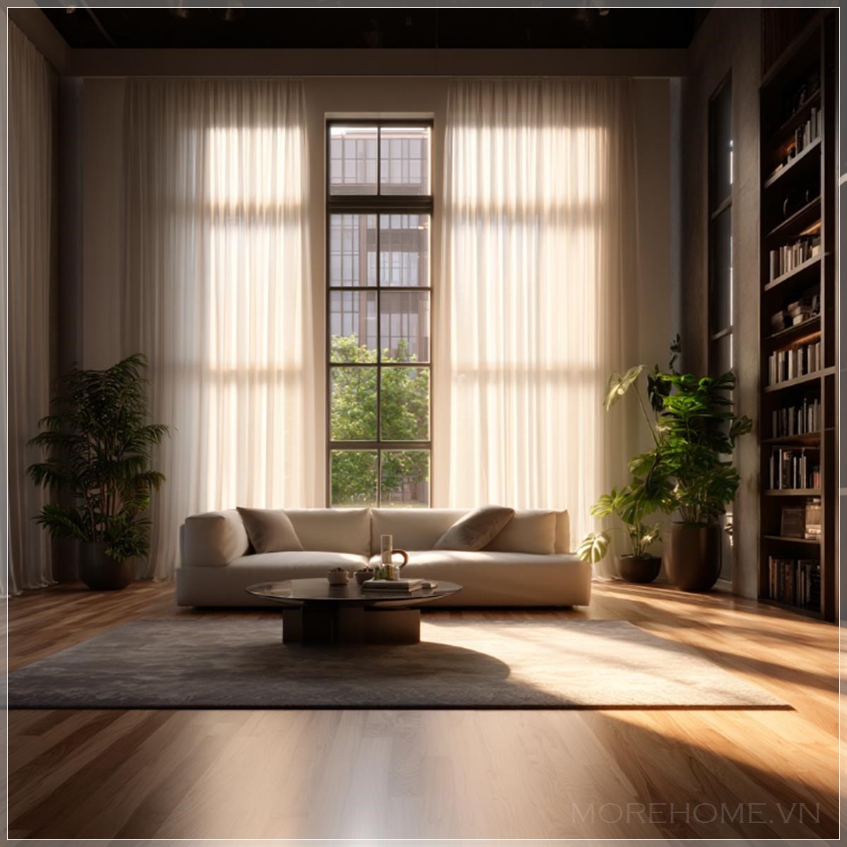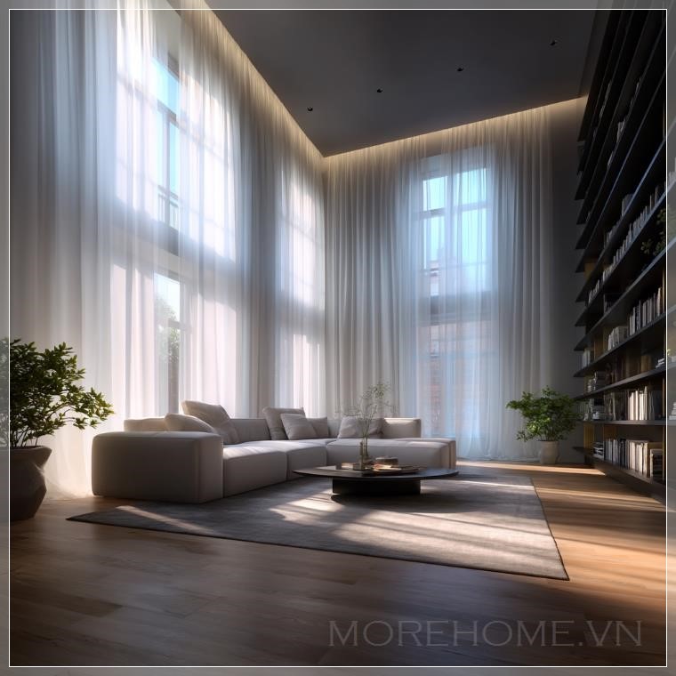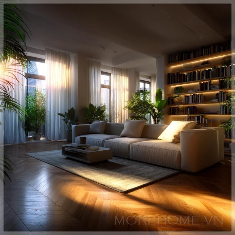 Ánh nắng ban mai rọi qua những tấm rèm mỏng, tạo nên một bức tranh ánh sáng dịu nhẹ trải dài trên sàn gỗ ấm áp. Không gian sống rộng rãi hiện ra trước mắt như một bản hòa tấu hoàn hảo giữa sự tinh tế và sự thoải mái. Đây không đơn thuần chỉ là một căn phòng khách – đây là trái tim của ngôi nhà, nơi mỗi chi tiết đều được sắp đặt với một mục đích rõ ràng: tạo nên cảm giác bình yên.