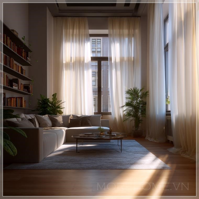 Ánh sáng tự nhiên là nghệ sĩ chính trong bức tranh không gian này. Khi ánh nắng chiếu qua những tấm rèm mỏng, nó tạo nên những vệt sáng tối đan xen, như những nốt nhạc trầm bổng trong một bản nhạc giao hưởng. Bóng đổ nhẹ nhàng của cây xanh trên tường tạo nên một bức họa động, thay đổi theo từng thời điểm trong ngày.