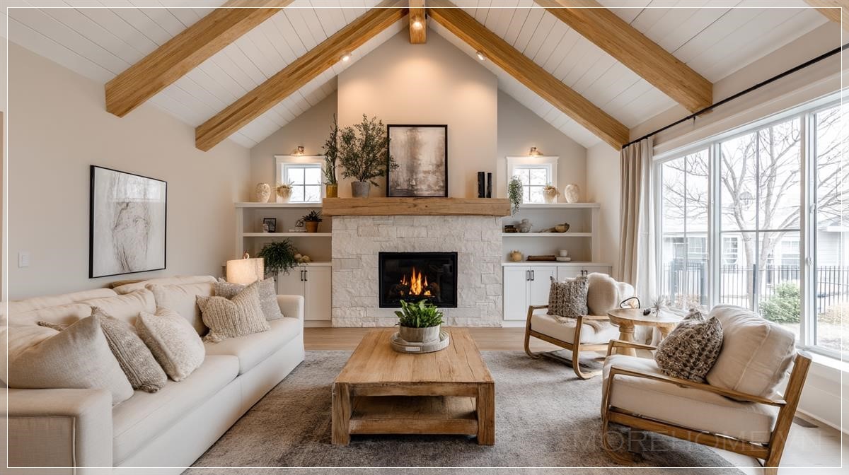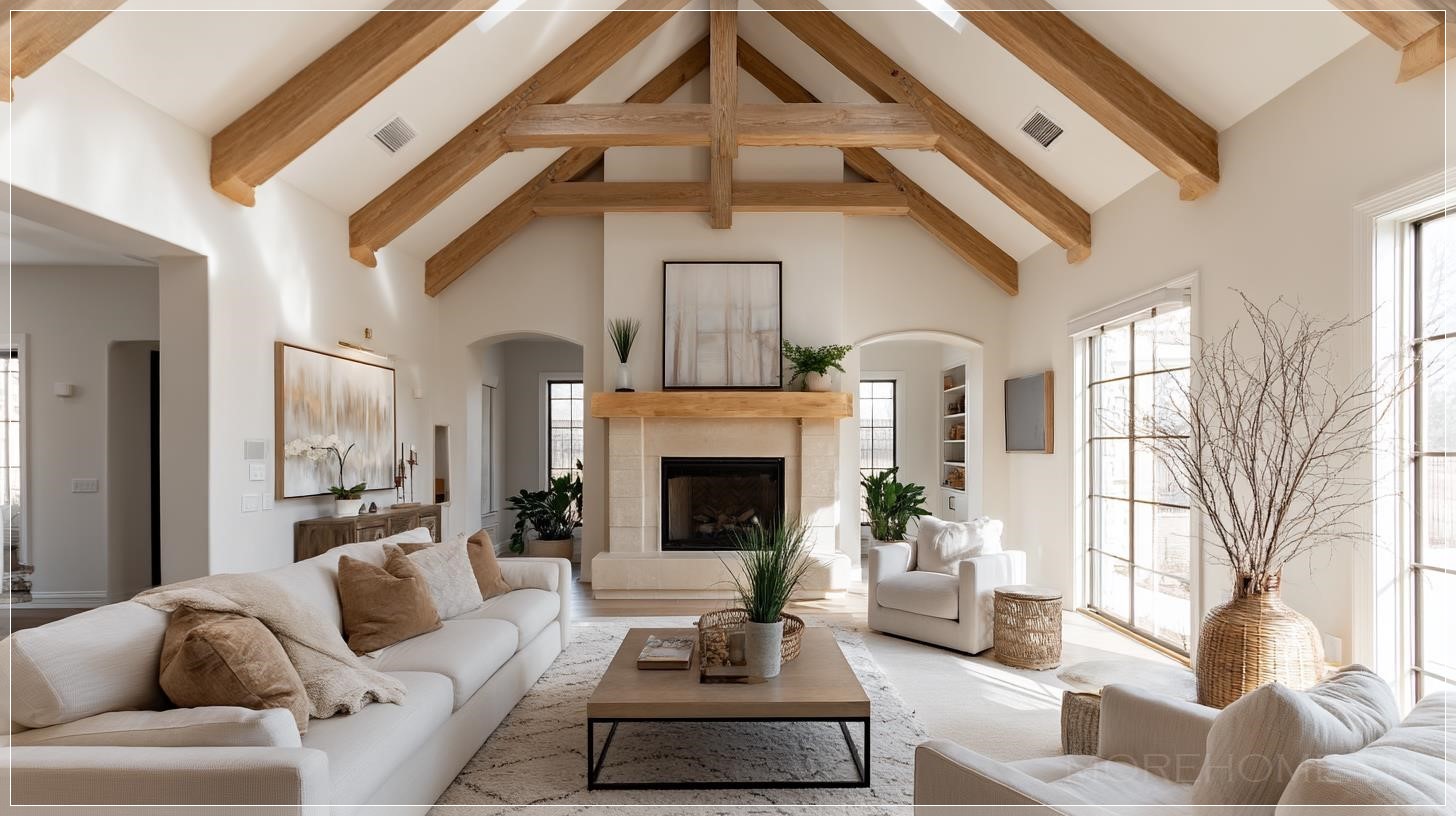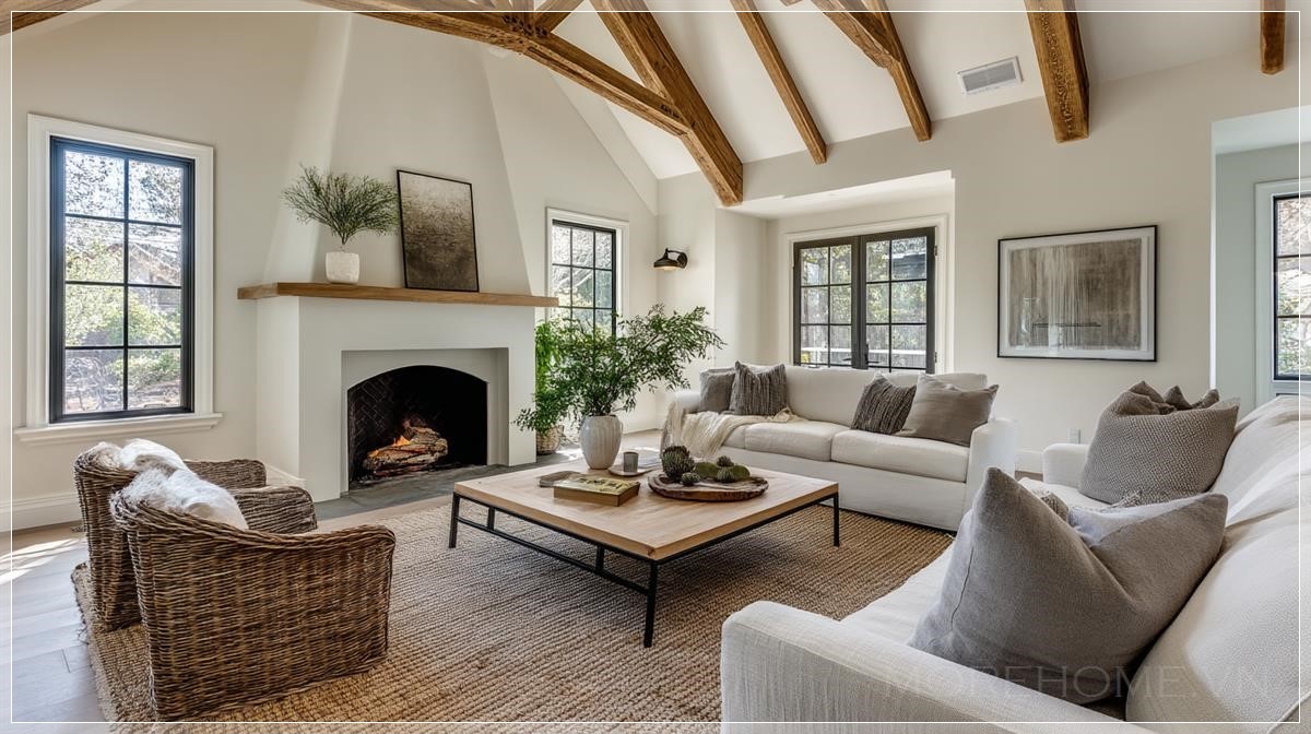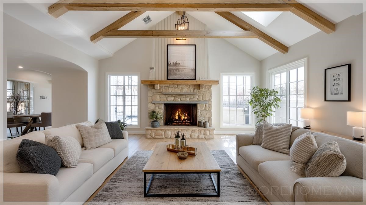 Bước vào căn phòng khách được thiết kế theo phong cách farmhouse hiện đại này, điều đầu tiên thu hút ánh nhìn chính là trần nhà cao vút với những thanh xà gỗ lộ thiên. Kiến trúc này không chỉ mang đến cảm giác không gian rộng mở, thoáng đãng mà còn là một điểm nhấn đậm chất rustic đặc trưng. Những thanh xà gỗ với màu sắc tự nhiên tạo nên sự tương phản nhẹ nhàng trên nền trần trắng tinh khôi, như một lời nhắc nhở về nguồn cội mộc mạc của phong cách này.