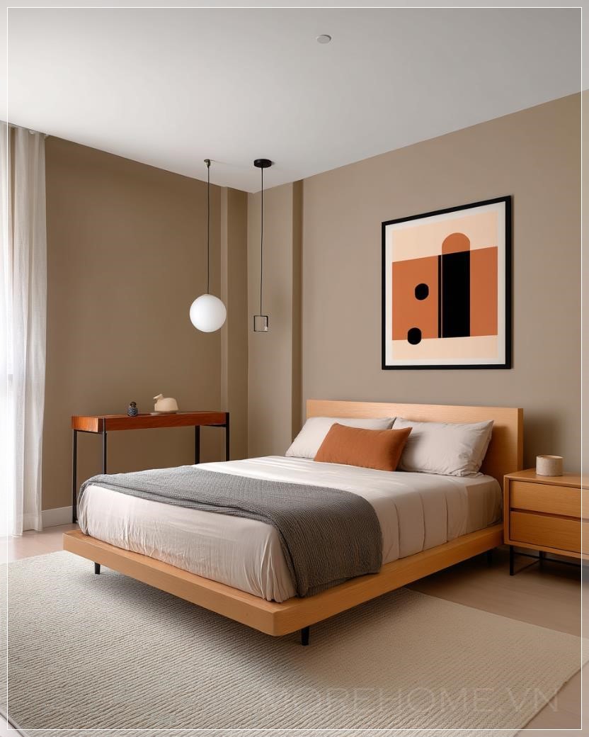 Bước vào không gian phòng ngủ này, điều đầu tiên khiến bạn chú ý chính là sự hài hòa tuyệt vời giữa ánh sáng tự nhiên dịu nhẹ và những gam màu đất ấm áp. Đây không phải là sự trùng hợp ngẫu nhiên, mà là kết quả của một quá trình thiết kế được tính toán kỹ lưỡng, nơi mỗi yếu tố đều phục vụ cho mục tiêu tạo nên một không gian thư giãn và thanh bình.