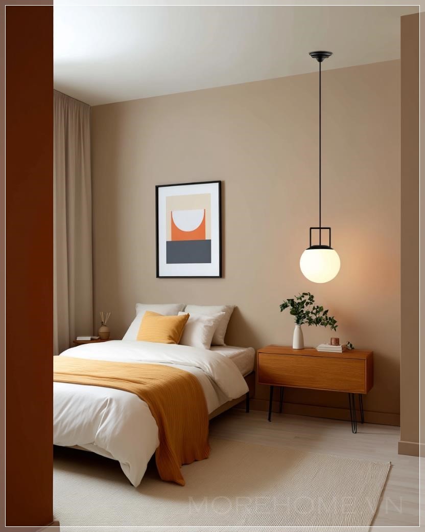 Ánh sáng từ chiếc đèn thả pendant tạo nên một vầng halo dịu nhẹ, không chói mắt nhưng đủ để làm nổi bật từng chi tiết quan trọng trong căn phòng. Ánh sáng này không chỉ mang tính năng chiếu sáng mà còn góp phần tạo nên bầu không khí ấm cúng và thư giãn, biến phòng ngủ thành một sanctuary thực sự sau những ngày dài mệt mỏi.