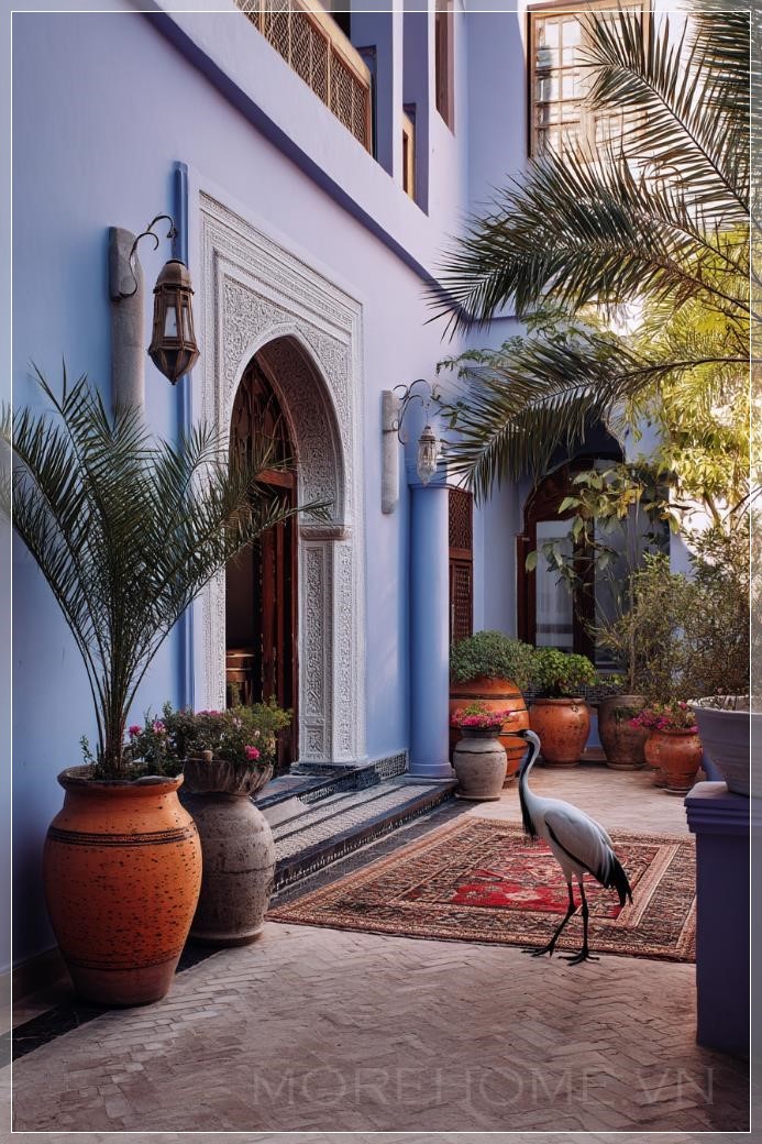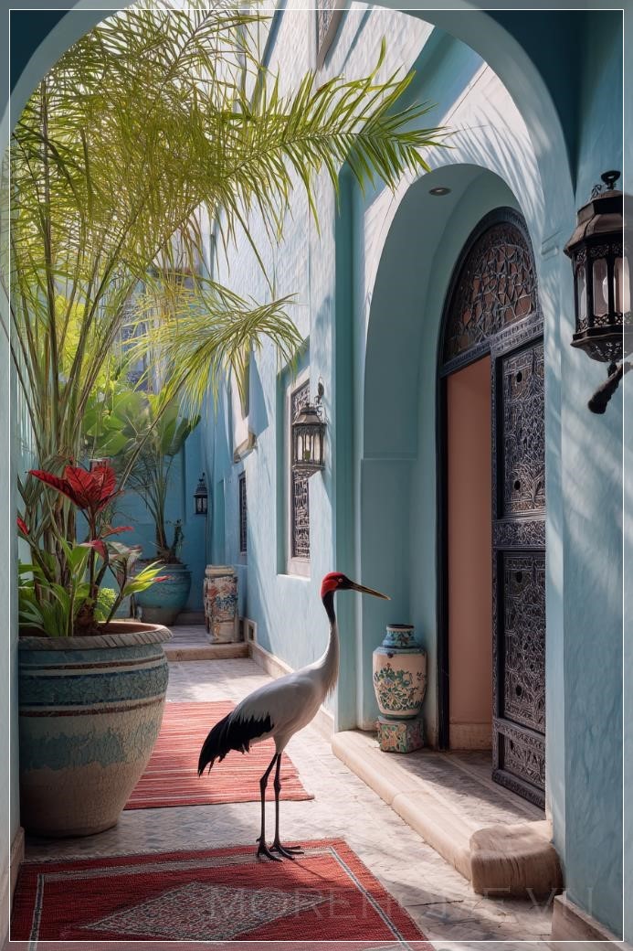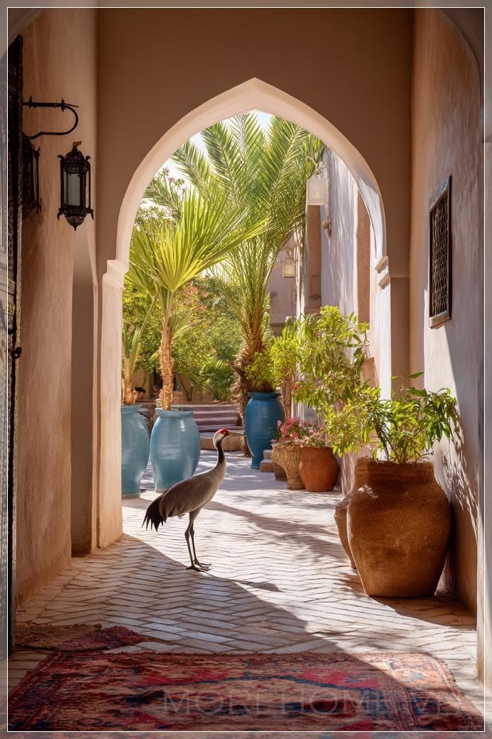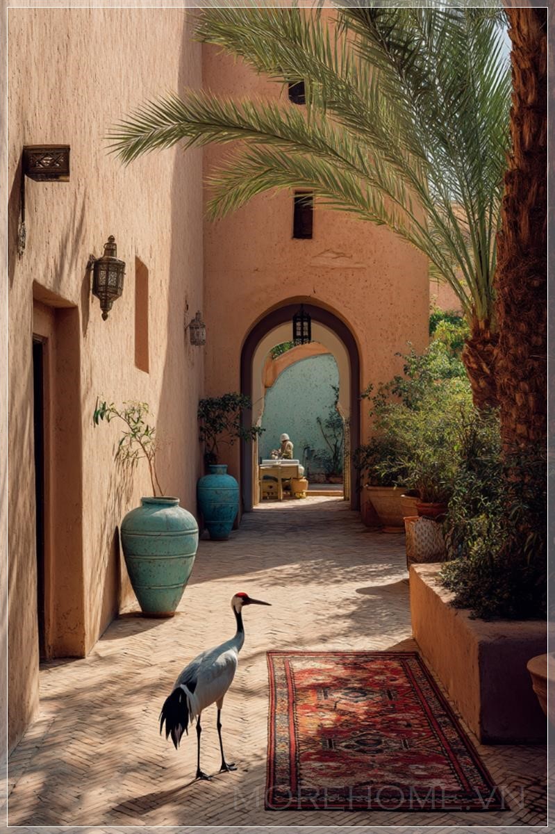 Ánh sáng ban mai len lỏi qua những ô cửa sổ cổ kính, tạo nên những vệt sáng vàng óng trên nền đá lát cổ. Trong khoảnh khắc thiêng liêng ấy, một con hạc đỉnh đỏ đang đứng yên lặng trước cổng vòm dẫn vào sân trong, như thể đang chiêm ngưỡng vẻ đẹp bất tử của kiến trúc Maroc cổ điển.