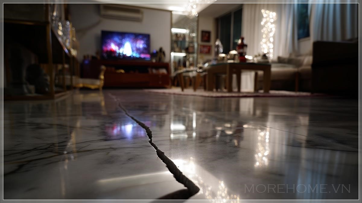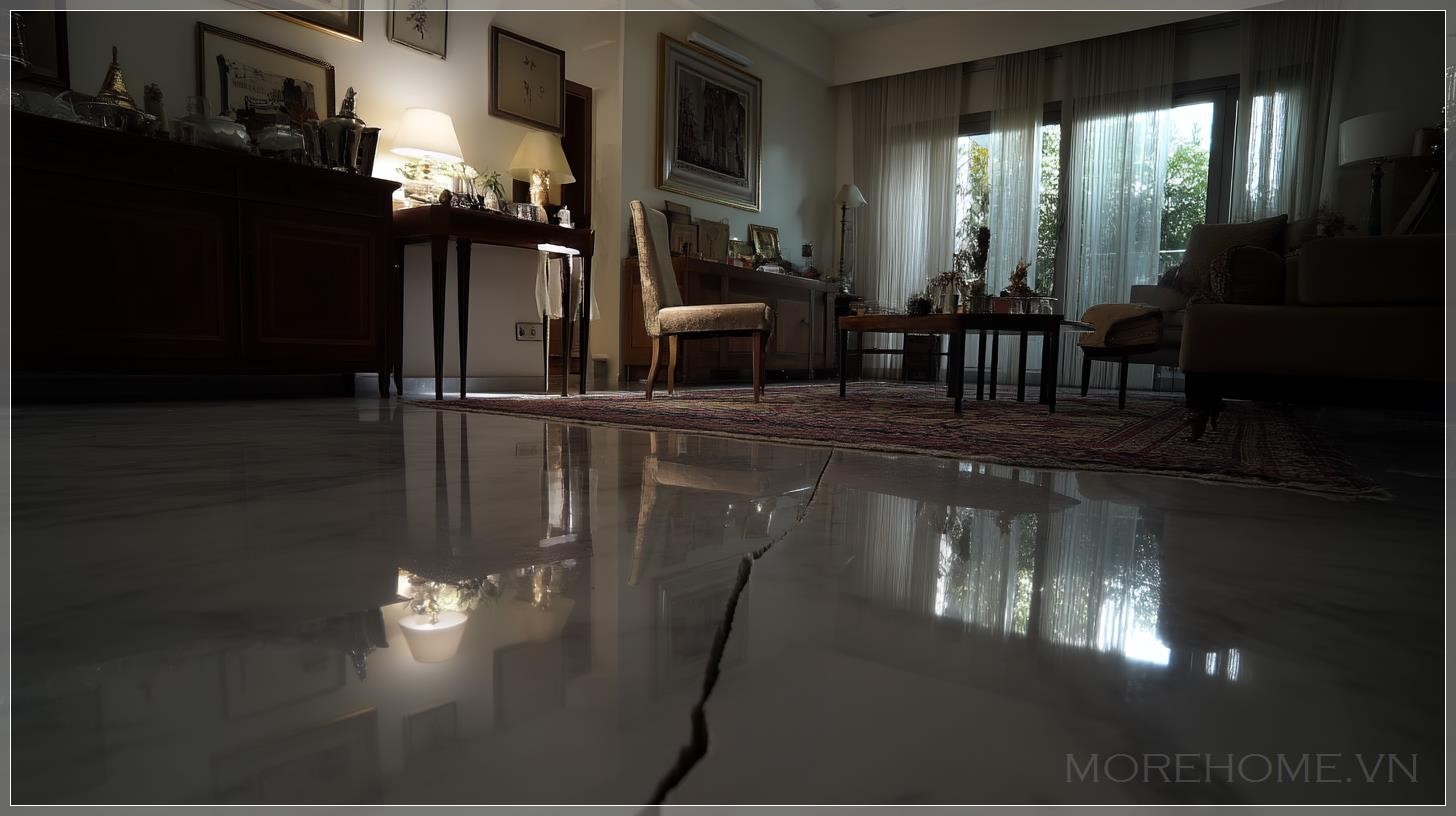 Ánh sáng chiều tà len lỏi qua khung cửa sổ lớn, tạo nên những dải sáng vàng ấm áp trải dài trên mặt sàn đá cẩm thạch trắng của phòng khách. Trong khoảnh khắc yên tĩnh ấy, một chi tiết nhỏ bé thu hút ánh mắt - một vết nứt tự nhiên mảnh mai chạy dọc theo viên đá, như một đường vẽ tinh tế của thời gian trên tác phẩm nghệ thuật tự nhiên này.