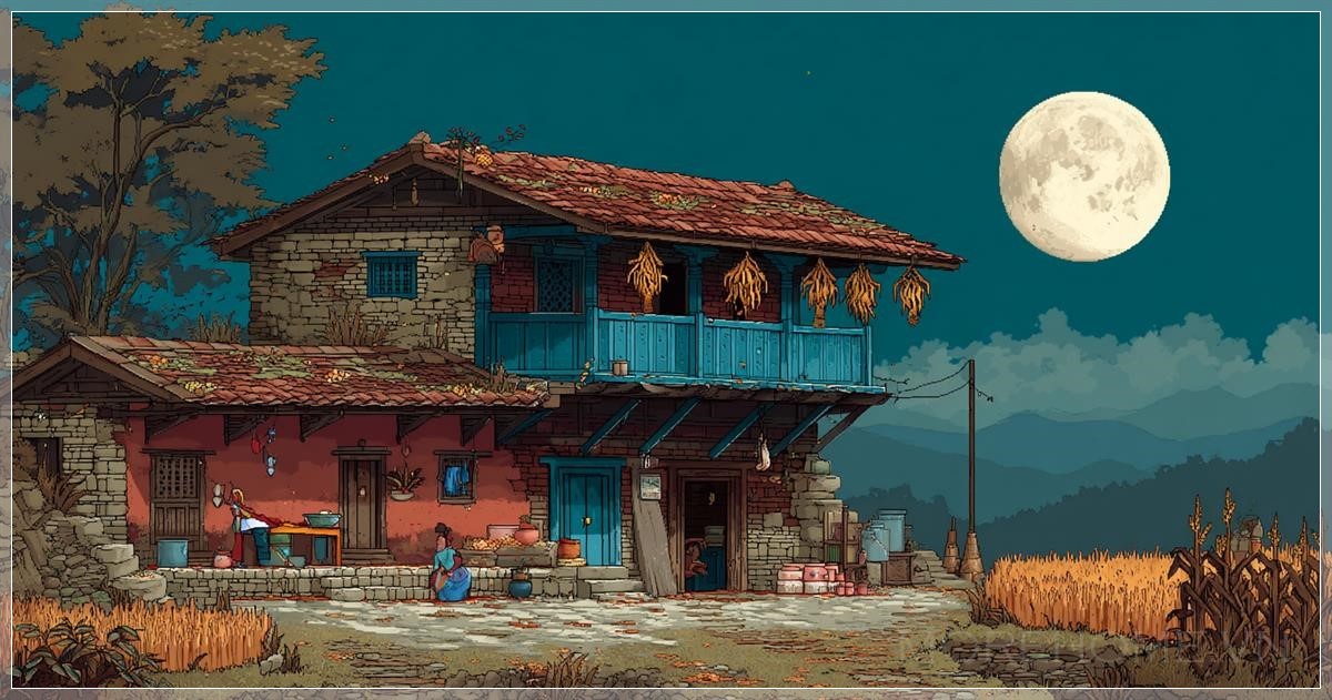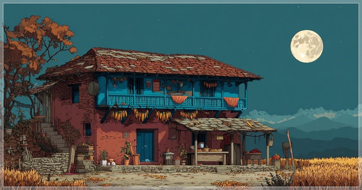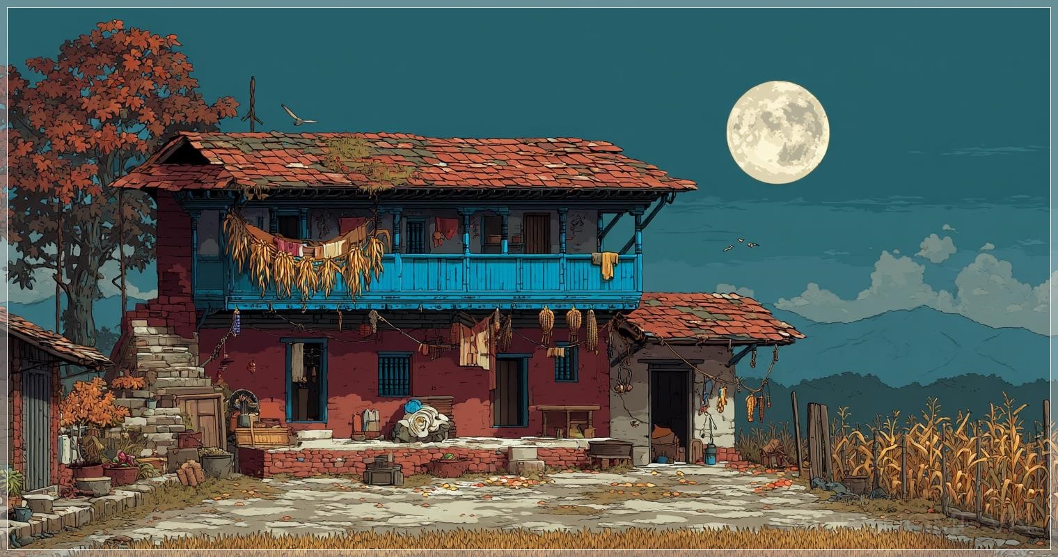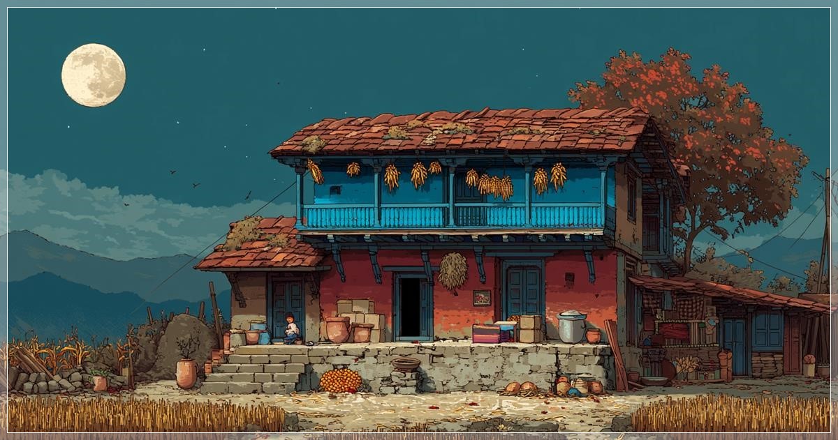 Trong ánh trăng bạc phủ khắp thung lũng, ngôi nhà Nepal nhỏ bé hiện lên như một bức tranh anime lofi đầy thơ mộng. Những bức tường terracotta ấm áp phản chiếu ánh sáng dịu dàng của mặt trăng tròn, tạo nên một khung cảnh vừa quen thuộc vừa huyền bí, như thể thời gian đã ngừng trôi trong khoảnh khắc này.