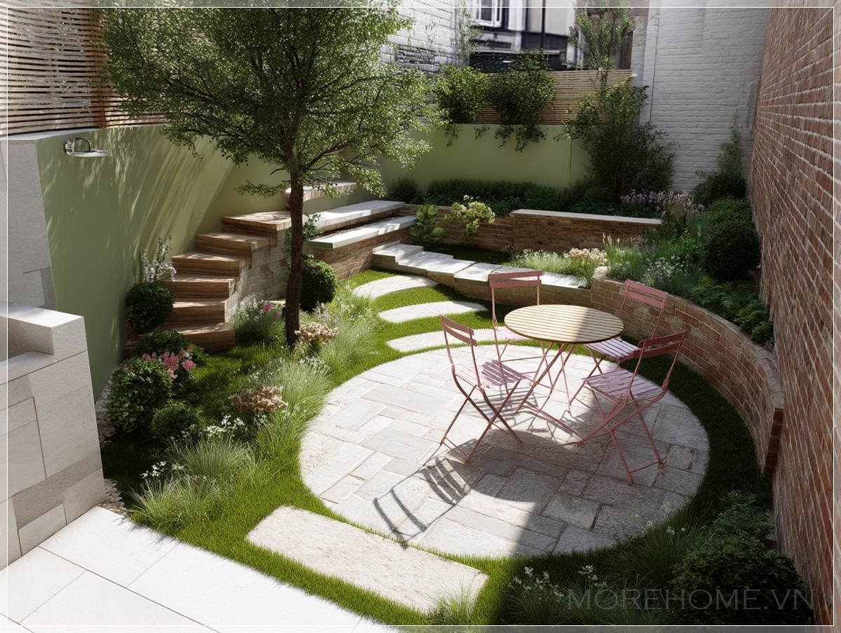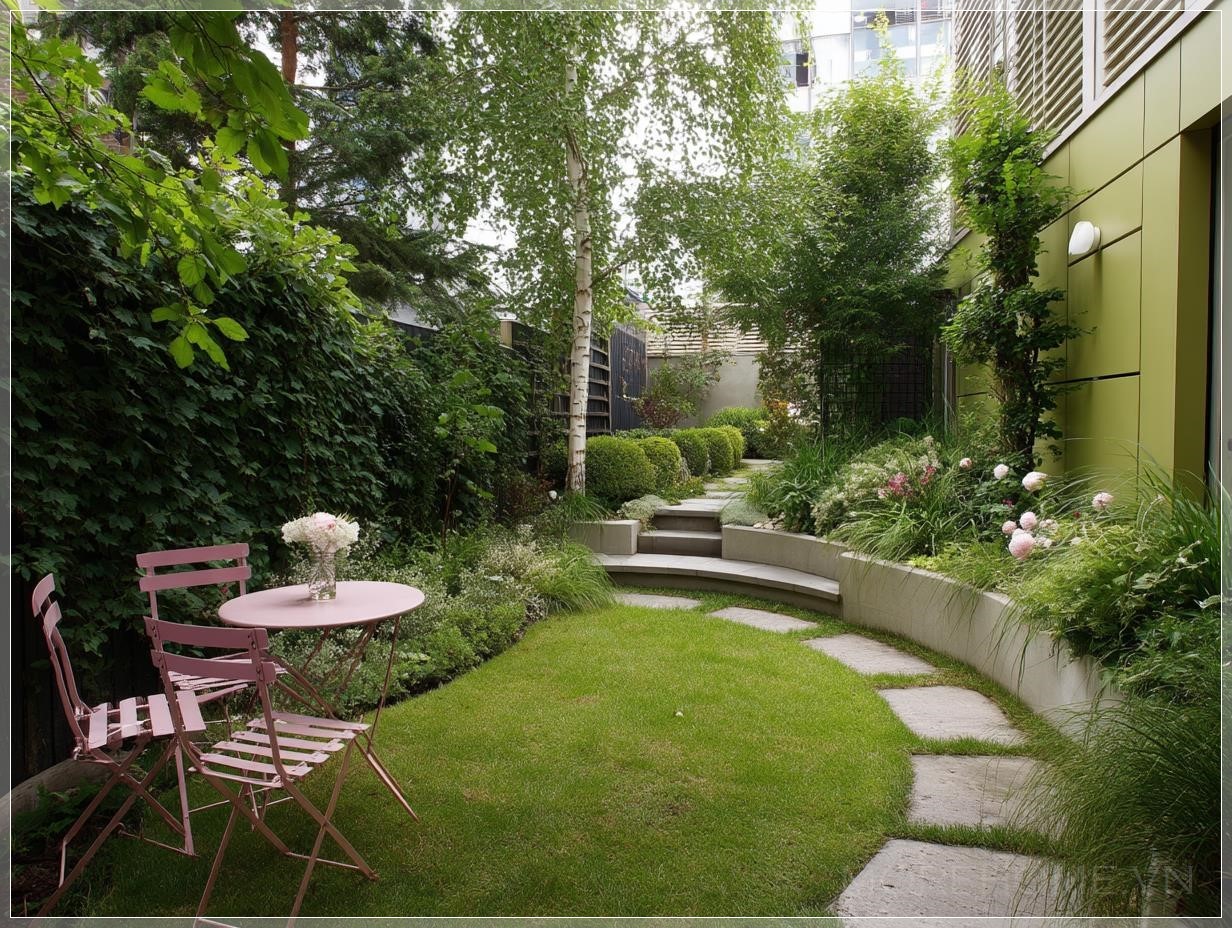 Với người yêu thiên nhiên nhưng sống giữa thành phố, mẫu vườn này còn có thể được triển khai như một góc đọc sách, uống trà hay thiền định. Việc kết hợp các yếu tố tự nhiên như cây bụi thấp, cỏ trang trí, và ánh sáng tự nhiên giúp nâng cao chất lượng trải nghiệm sống. Dù chỉ là vài phút trong ngày, nhưng khi được thảnh thơi ngồi dưới bóng cây, tựa lưng vào chiếc ghế hồng giữa không gian xanh mướt, mọi căng thẳng như được xua tan.